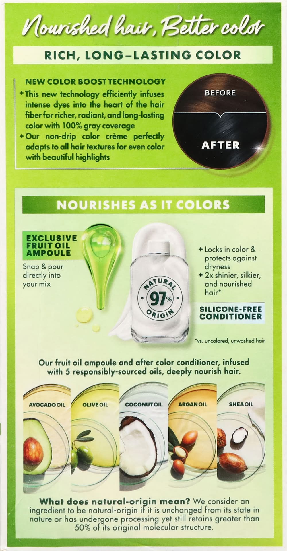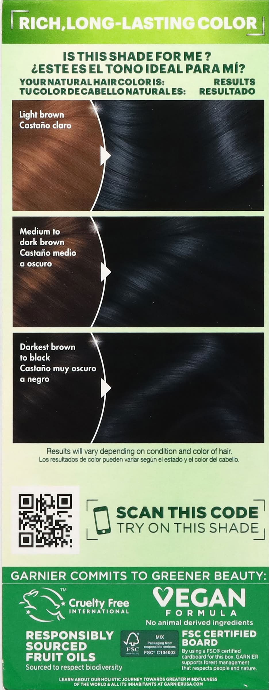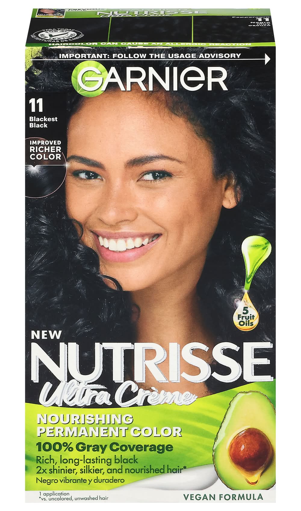 Garnier Nutrisse shade 11 blackest black is our darkest black shade with hints of cool tones. It provides 100% gray coverage and is best for anyone with natural hair between light brown and black. For black shades with different tones, explore 10, 12, 20 and 22. For a lighter cool shade, 31 might be for you. If you have color treated hair, there are special considerations for finding the perfect shade for you. Permanent, nourishing color creme with three fruit oils: Avocado, olive and shea The only color creme with a separate ampoule of grape seed oil to start nourishing as you color Rich, radiant, long lasting color with 100% gray coverage Available in 62 nourishing shades. Color: 11 blackest black