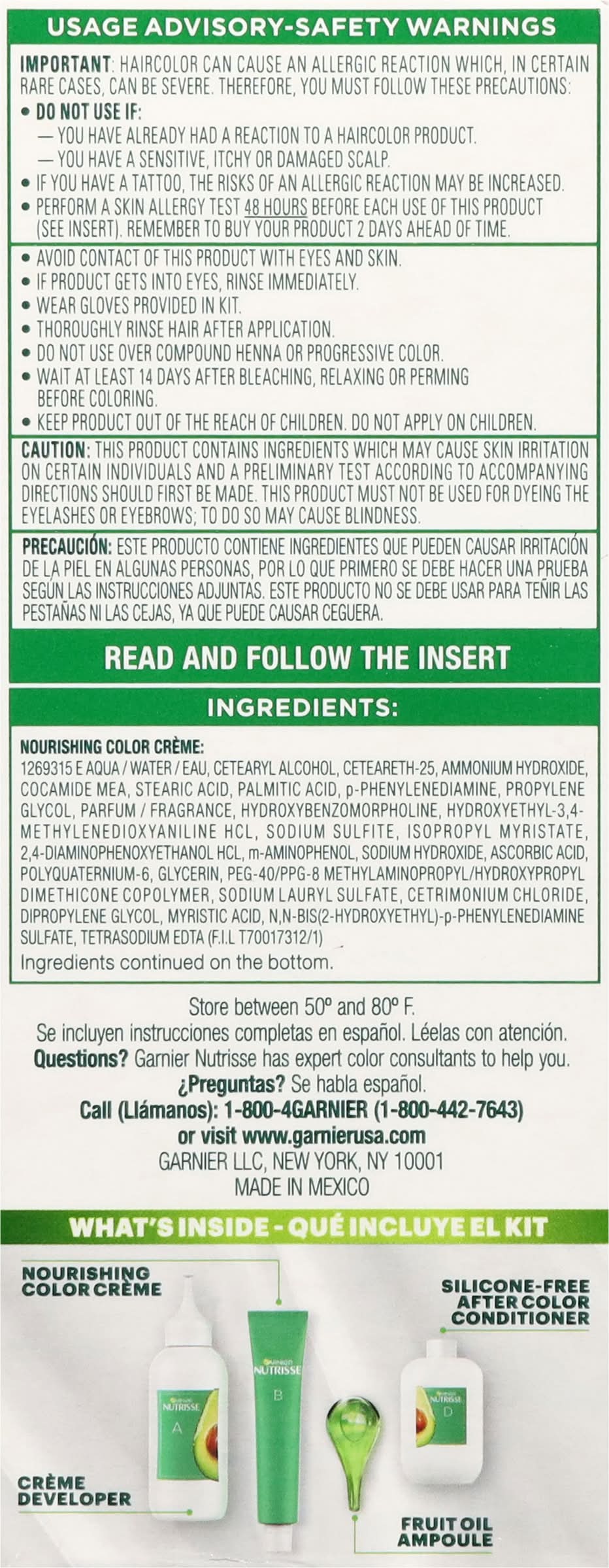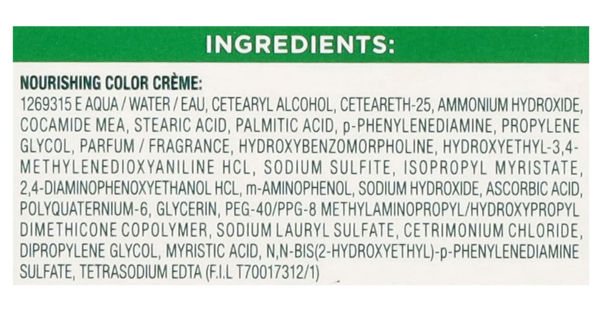 Ingredients: Colorant: Aqua/Water/Eau, Cetearyl Alcohol, Propylene Glycol, Deceth-3, Laureth-12, Oleth-30, Ammonium Hydroxide, Lauric Acid, Hexadimethrine Chloride, Glycol Distearate, P-Phenylenediamine, Polyquaternium-22, Ethanolamine, Silica Dimethyl Silylate, CI 77891/Titanium Dioxide, 2, 4-Diaminophenoxyethanol HCl, M-Aminophenol, Ascorbic Acid, Tocopherol, Sodium Metabisulfite, Helianthus Annuus Seed Oil/Sunflower Seed Oil, Dimethicone, Pentasodium Pentetate, N, N-Bis2-Hydroxyethyl-P-Phenylenediamine Sulfate, Parfum/Fragrance, Carbomer, Resorcinol, Rosmarinus Officinalis Rosemary Extract, Vitis Vinifera Seed Oil/Grape Seed Oil. Fruit Oil Concentrate: Paraffinum Liquidum/Mineral Oil/Huile Minerale, Vitis Vinifera Seed Oil/Grape Seed Oil, Parfum/Fragrance, Tocopherol, Rosmarinus Officinalis Rosemary. Rinse-Out Conditioner: Aqua/Water/Eau, Cetearyl Alcohol, Elaeis Guineensis Oil/Palm Oil, Behentrimonium Chloride, Pyrus Malus Extract/Apple Fruit Extract, Glycerin, Parfum/Fragrance, Isopropyl Alcohol, Stearamidopropyl Dimethylamine, Niacinamide, Pyridoxine HCl, Butyrospermum Parkii Butter/Shea Butter, Citric Acid, Olea Europaea Oil/Olive Fruit Oil, Saccharum Officinarum Extract/Sugar Cane Extract/Extrait De Canne a Sucre, Benzyl Alcohol, Chlorhexidine Dihydrochloride, Persea Gratissima Oil/Avocado Oil, Ribes Nigrum Oil/Black Currant Seed Oil, Linalool, Citrus Medica Limonum Peel Extract/Lemon Peel Extract, CI 19140/Yellow 5, Camellia Sinensis Leaf Extract, CI 15985/Yellow 6. Developer: Aqua/Water/Eau, Hydrogen Peroxide, Cetearyl Alcohol, Trideceth-2 Carboxamide MEA, Ceteareth-25, Glycerin, Pentasodium Pentetate, Sodium Stannate, Tetrasodium Pyrophosphate, Phosphoric Acid. Contains: Sulfites, Tree Nuts, Sheanuts, Tree Nuts, Coconuts, Tree Nuts, Argan Nuts
