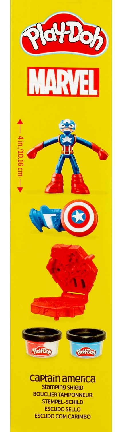 Power up kids’ imaginations with the Play-Doh Marvel Captain America Stamping Shield playset! The 4-inch (10.16 cm) bendy action figure and Play-Doh accessories let kids play out epic stories. Imagine battling a Play-Doh Ultron, flying over the city with a Play-Doh jetpack, and capturing baddies as you roll the Stamping Shield tool. Use the Play-Doh colors to customize the Captain America action figure’s chest logo or imagine other upgrades to his suit. These Play-Doh Captain America toys for boys and girls come with 2 ounces (57 g) of classic Play-Doh modeling compound. This Play-Doh kit is great for kids’ gifts, fans of superhero figures, arts and crafts activities, and sensory play. PLAY-DOH and HASBRO and all related trademarks and logos are trademarks of Hasbro, Inc. Copyright MARVEL. All trademarks and registered trademarks are the property of their respective owners. SUPER BENDY CAPTAIN AMERICA: Creative power is in kids’ hands with this Play-Doh set featuring a Captain America action figure with wiggly, flexible arms and legs and a star mold in the chest. 4 in (10.16 cm) figure. STAMPING SHIELD TOOL: Attach the Captain America shield tool to the figure’s hand, flatten out some Play-Doh compound, and roll the shield’s edge through the compound to stamp stars. CREATE PLAY-DOH POWERUPS: Use the book mold to create an attachable jetpack and shield for the Captain America figure, or make a mini Play-Doh Ultron for imaginary battles. SHIELD ACCESSORY IS REMOVABLE: Kids can attach the shield stamper tool to the figure's arm to gear up for battle. ASSEMBLE YOUR PLAY-DOH MARVEL TEAM: Look for more Marvel Play-Doh toys like Spider-Man, Black Panther, Iron Man, and The Hulk (sold separately, subject to availability). STAND AND DISPLAY THE FIGURE: The book mold doubles as a display stand to keep the pieces together. IMAGINATION TOYS FOR KIDS: Grab some cool gifts for kids 4 years and up who love super hero toys, sensory toys, and imaginative play with these Play-Doh Marvel toys.