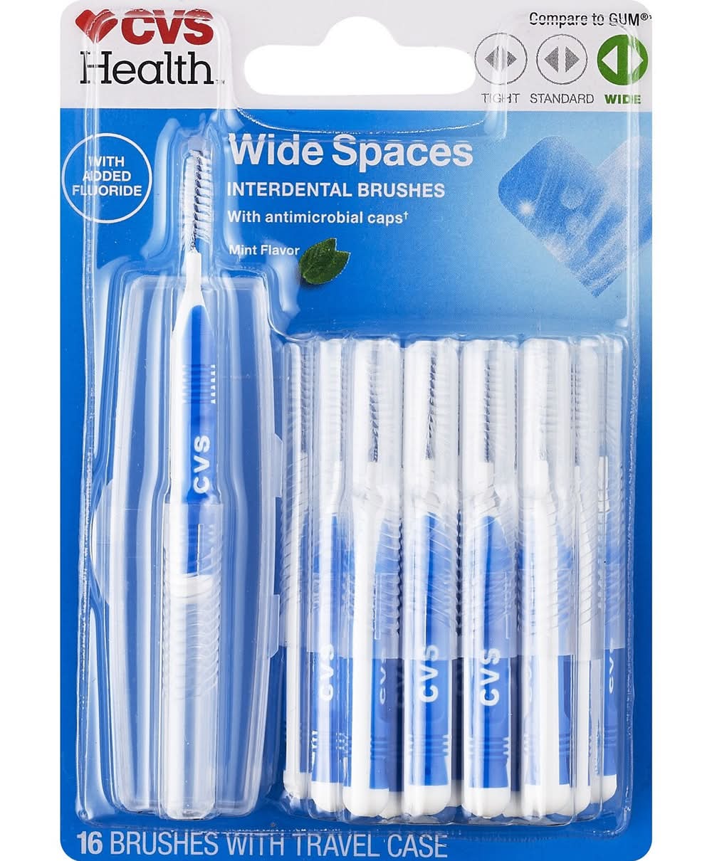 CVS Health Interdental Brushes are designed with soft, bristled ends to clean wide spaces between teeth and effectively remove food particles and plaque from teeth, braces, and bridges to help prevent gum disease and mouth odor from bacteria growth. CVS Health Quality - Money Back Guarantee Made in China 16 Brushes & Travel Case Removes plaque and cleans between teeth Free storage/carrying case