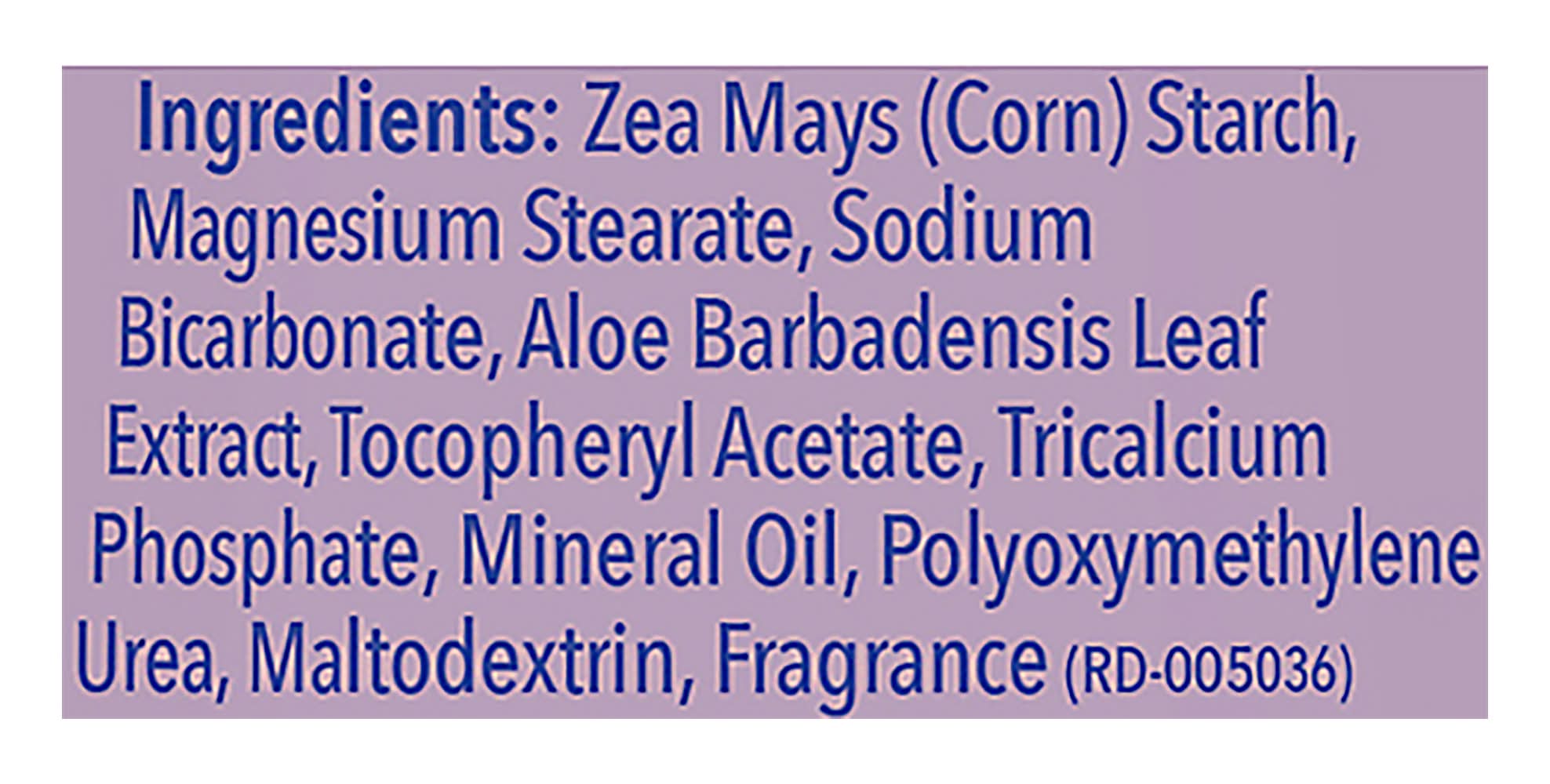 Ingredients: Zea Mays (Corn) Starch, Magnesium Stearate, Sodium Bicarbonate, Aloe Barbadensis Leaf Extract, Tocopheryl Acetate, Tricalcium Phosphate, Mineral Oil, Polyoxymethylene Urea, Maltodextrin, Fragrance
