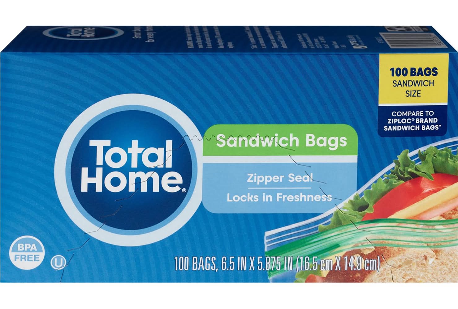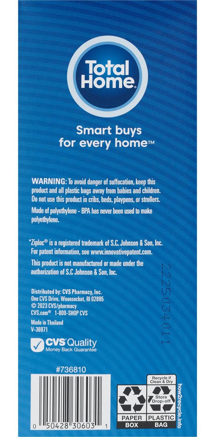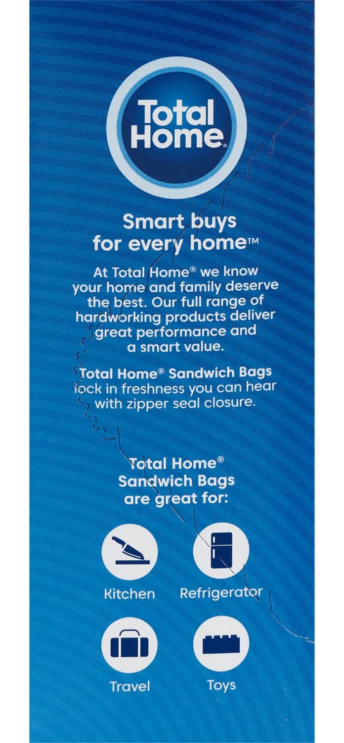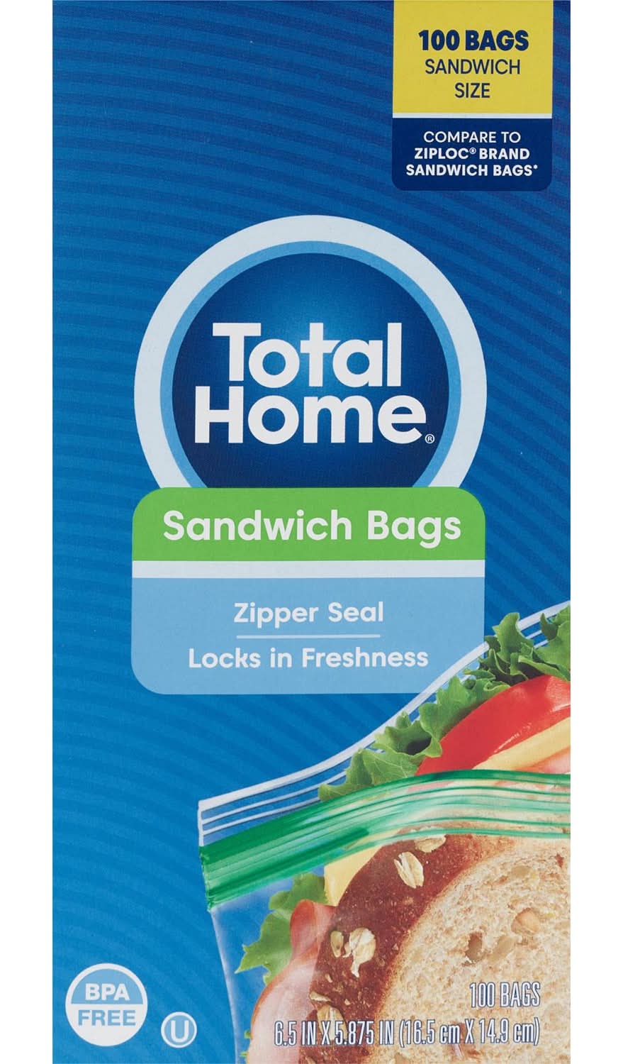 6.5 x 5.875 inch. Zipper seal. Locks in freshness. Compare to Ziploc brand sandwich bags (Ziploc is a registered trademark of SC Johnson & Son, Inc. This product is not manufactured or made under the authorization of SC Johnson & Son Inc.). Total Home by CVS/pharmacy offers a wide selection of household products that work hard and save you money. It's where performance and value live. Total Home sandwich bags lock in freshness you can hear with zipper seal technology. Total Home Sandwich Bags are great for: kitchen, refrigerator, travel, toys. SFI certified sourcing. BPA free. 100% recycled paperboard. CVS quality money back guarantee. Made in the USA. • Size: 6.5x5.87 in • Packaging: Reusable