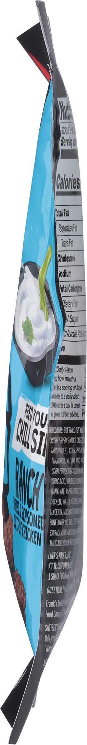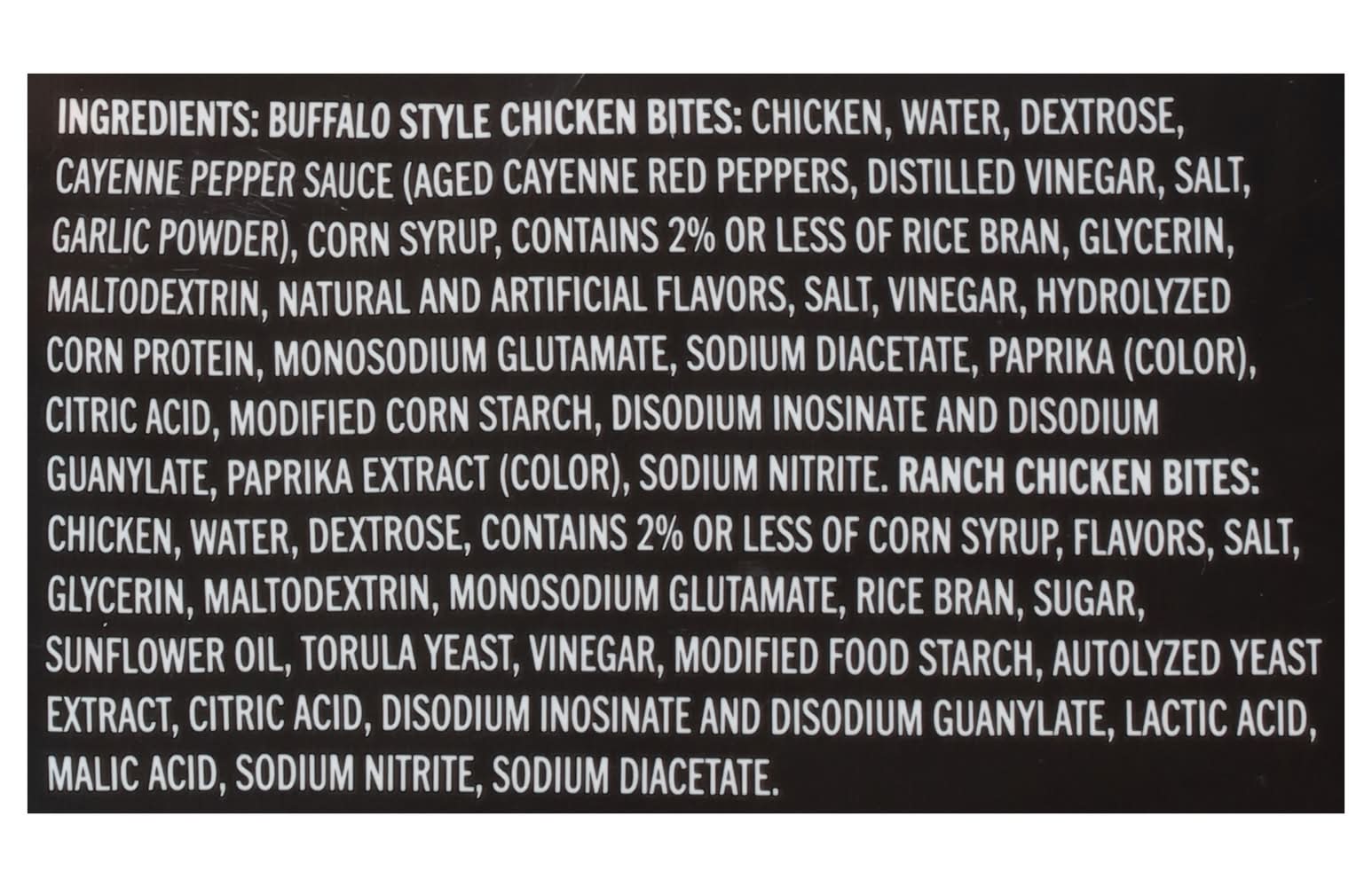 Ingredients: Buffalo Style Chicken Bites: Chicken, Water, Dextrose, Cayenne Pepper Sauce (Aged Cayenne Red Peppers, Distilled Vinegar, Salt, Garlic Powder), Corn Syrup, Contains 2% or Less of Rice Bran, Glycerin, Maltodextrin, Natural and Artificial Flavors, Salt, Vinegar, Hydrolyzed Corn Protein, Monosodium Glutamate, Sodium Diacetate, Paprika (Color), Citric Acid, Modified Corn Starch, Disodium Inosinate and Disodium Guanylate, Paprika Extract (Color), Sodium Nitrite, Ranch Chicken Bites: Chicken, Water, Dextrose, Contains 2% or Less of Corn Syrup, Flavors, Salt, Glycerin, Maltodextrin, Monosodium Glutamate, Rice Bran, Sugar, Sunflower Oil, Torula Yeast, Vinegar, Modified Food Starch, Autolyzed Yeast Extract, Citric Acid, Disodium Inosinate and Disodium Guanylate, Lactic Acid, Malic Acid, Sodium Nitrite, Sodium Diacetate