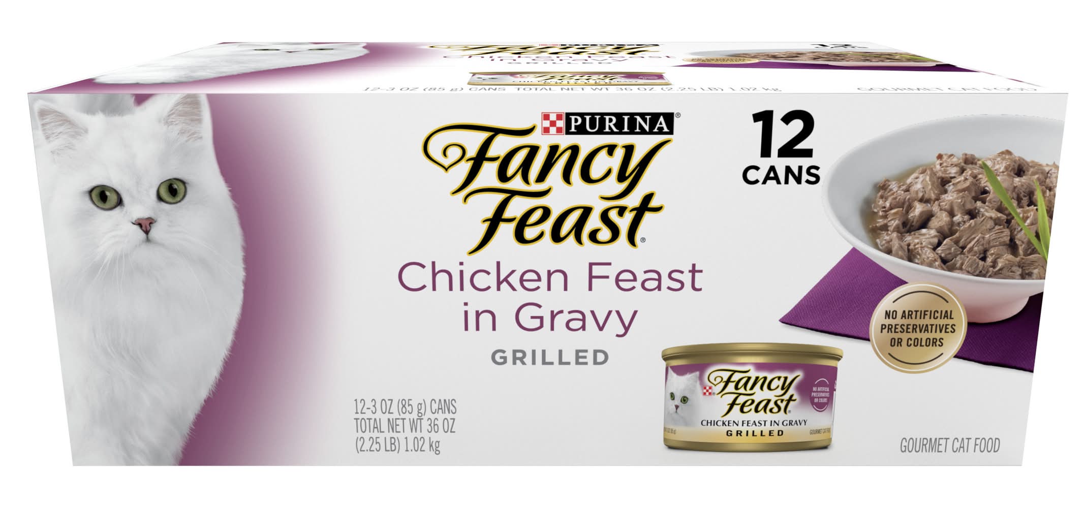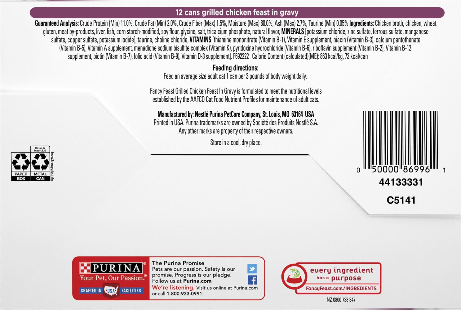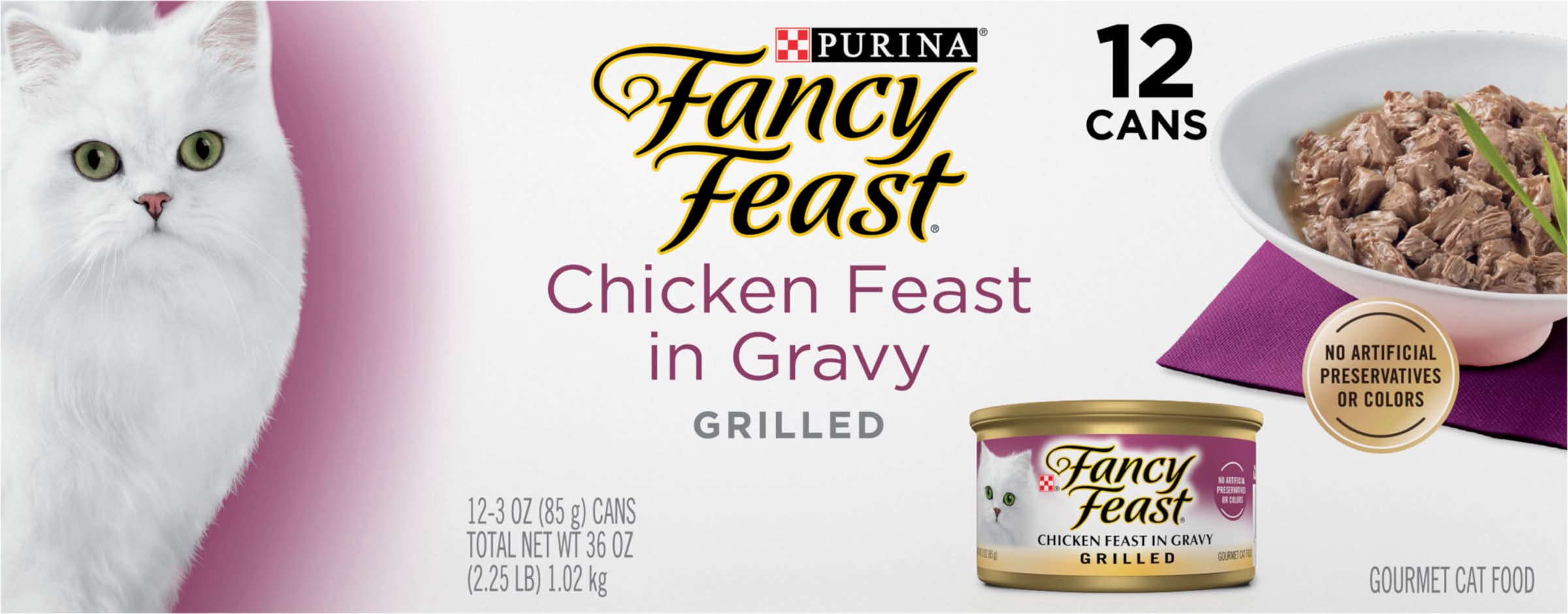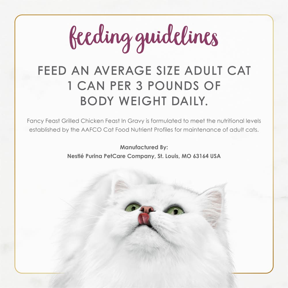 Let Fancy Feast delight your cat with an exceptional mealtime experience every time you open a can of Fancy Feast Grilled Cat Food Chicken Feast in Gravy Cat Food. Crafted in partnership with our expert chefs and nutritionists, this protein-rich, wet food for cats features the irresistible taste of real chicken while delivering 100 percent complete and balanced nourishment. Also included in this flavorful, high-quality soft cat food is a blend of vitamins and minerals to support your cat’s whole body health and a light, savory cat food gravy to tempt their tastebuds. This premium canned cat food recipe is made without artificial colors or preservatives, so you know your cat is getting everything they need and nothing they don’t. Show your cat how much you care with a can of Grilled Fancy Feast wet cat food and watch them savor the spellbinding aroma, enticing texture and delectable flavor sensation down to the very last bite. Pack size: 12