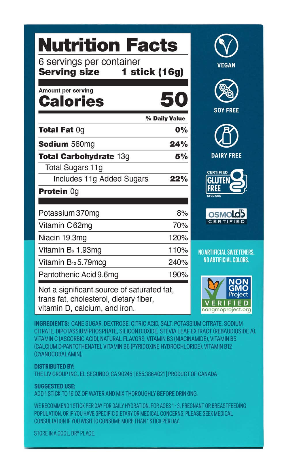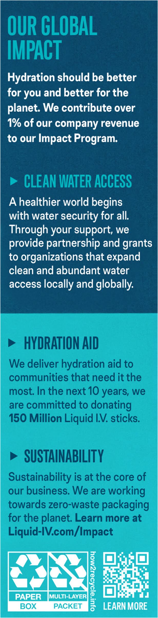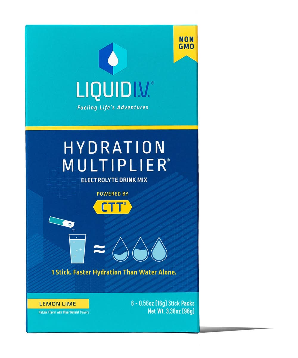 New Holiday Series Hydration Multiplier® Lemon Lime is a non-GMO electrolyte mix that delivers hydration faster than water alone. Powered by LIV HYDRASCIENCE, a science-backed formula designed with 3x the electrolytes of the leading sports drink, and 8 vitamins and nutrients. And 8 vitamins and nutrients including 100% of your daily B3, B5, B6 & B12 for extraordinary hydration in every season of life. Holiday packaging available for a limited-time only. HOLIDAY HYDRATION SERIES: Same Lemon Lime flavor in limited edition holiday packaging GREAT TASTE: Lemon Lime is zesty and bright, with a punch of citrus flavor. SCIENCE-BACKED FORMULA: Powered by LIV HYDRASCIENCE™, Liquid I.V.® is designed with an optimized ratio of electrolytes and clinically tested nutrients. EXTRAORDINARY HYDRATION: Hydration Multiplier® has 3x the electrolytes of the leading sports drink, and 8 vitamins and nutrients. It contains 100% of the daily value of 4 B vitamins: B3, B5, B6 and B12. Gluten-free, soy-free, and dairy-free. CONVENIENCE: Single-serving, travel-friendly packets are easy to enjoy on the go. Pour one easy-to-open packet into 16 oz of water, mix or shake, and hydrate. HYDRATION AID: Since 2015, we have donated over 55 million servings of Liquid I.V.® to those in need around the globe, and donate over 1% of our revenue to our Impact programs. • Flavor: Lemon lime • Pack size: 6 • Packaging: Reusable
