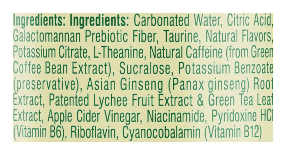 Ingredients: Carbonated Water, Citric Acid, Galactomannan Prebiotic Fiber, Taurine, Natural Flavors, Potassium Citrate, L-Theanine, Natural Caffeine (from Green Coffee Bean Extract), Sucralose, Potassium Benzoate (Preservative), Asian Ginseng (Panax Ginseng) Root Extract, Patented Lychee Fruit Extract & Green Tea Leaf Extract, Apple Cider Vinegar, Niacinamide, Pyridoxine HCl (Vitamin B6), Riboflavin, Cyanocobalamin (Vitamin B12).