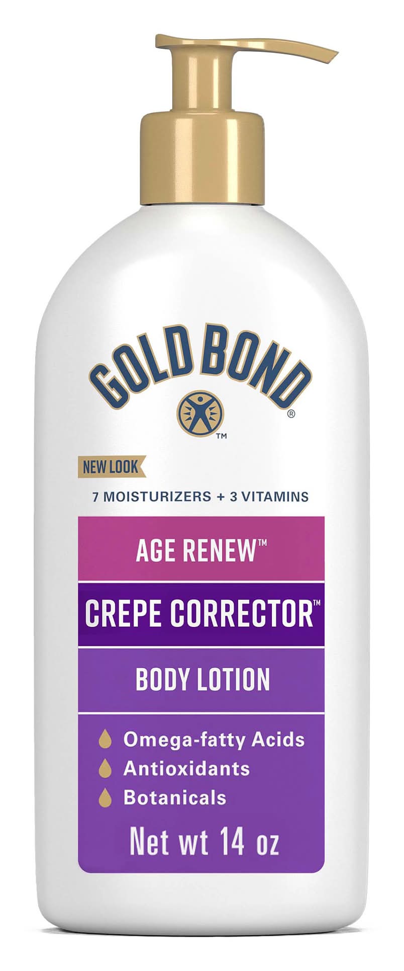 Gold Bond Age Renew Crepe Corrector Body Lotion is formulated with a blend of seven moisturizers and three vitamins, enriched with omega-fatty acids, antioxidants, and botanicals. Designed for individuals with normal to dry skin, it replenishes and smooths the skin's appearance, helping to reduce the visibility of crepey skin. An 82% improvement in skin texture was observed in as little as two days on areas like the back of hands and arms. The lotion provides deep hydration that lasts for 24 hours and has a fast-absorbing, non-greasy texture. It has been dermatologist-tested and is sold by weight. Packaging: Reusable