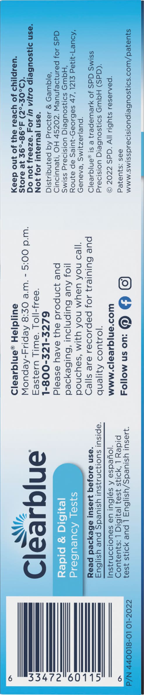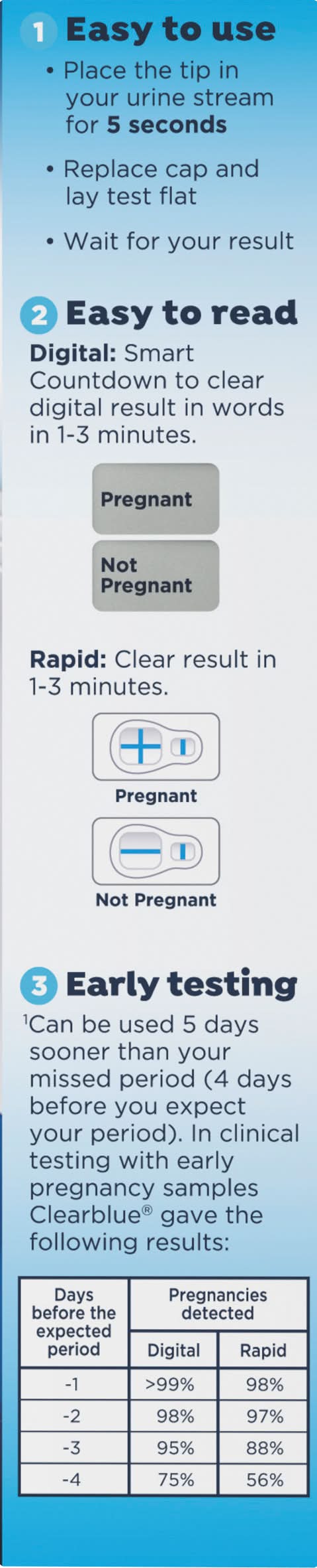 Directions for use: 1. Easy to Use: Place the tip in your urine stream for 5 seconds; Replace cap and lay test flat; Wait for your result. 2. Easy to Ready: Digital: Smart countdown to clear digital result in words in 1-3 minutes. Rapid: Clear result in 1-3 minutes. (3) Early Testing: Can be used 5 days sooner than your missed period (4 days before you expect your period). In clinical testing with early pregnancy samples Clearblue gave the following results: Days before the expected period: -1; Pregnancies detected: Digital: Greater than 99%; Rapid: 98%. Days before the expected period: -2; Pregnancies detected: Digital: 98%; Rapid: 97%. Days before the expected period: -3; Pregnancies detected: Digital: 95%; Rapid: 88%. Days before the expected period: -4; Pregnancies detected: Digital: 75%; Rapid: 56%. - Directions: 1. Easy to Use: Place the tip in your urine stream for 5 seconds; Replace cap and lay test flat; Wait for your result. 2. Easy to Ready: Digital: Smart countdown to clear digital result in words in 1-3 minutes. Rapid: Clear result in 1-3 minutes. (3) Early Testing: Can be used 5 days sooner than your missed period (4 days before you expect your period). In clinical testing with early pregnancy samples Clearblue gave the following results: Days before the expected period: -1; Pregnancies detected: Digital: Greater than 99%; Rapid: 98%. Days before the expected period: -2; Pregnancies detected: Digital: 98%; Rapid: 97%. Days before the expected period: -3; Pregnancies detected: Digital: 95%; Rapid: 88%. Days before the expected period: -4; Pregnancies detected: Digital: 75%; Rapid: 56%. Store at 36 degrees - 86 degrees F (2 degrees - 30 degrees C). Storage recommendation: Store at 36 degrees - 86 degrees F (2 degrees - 30 degrees C).