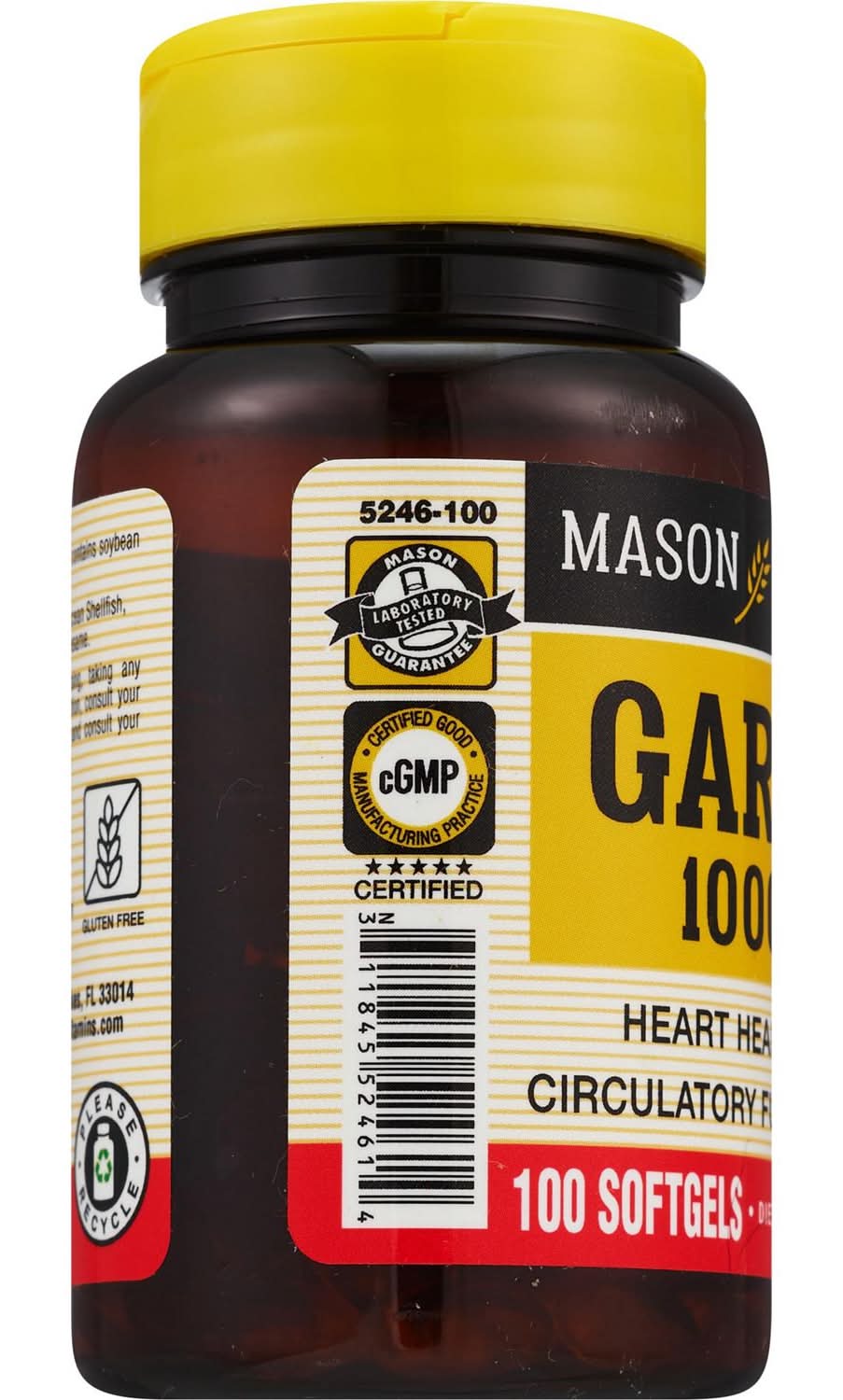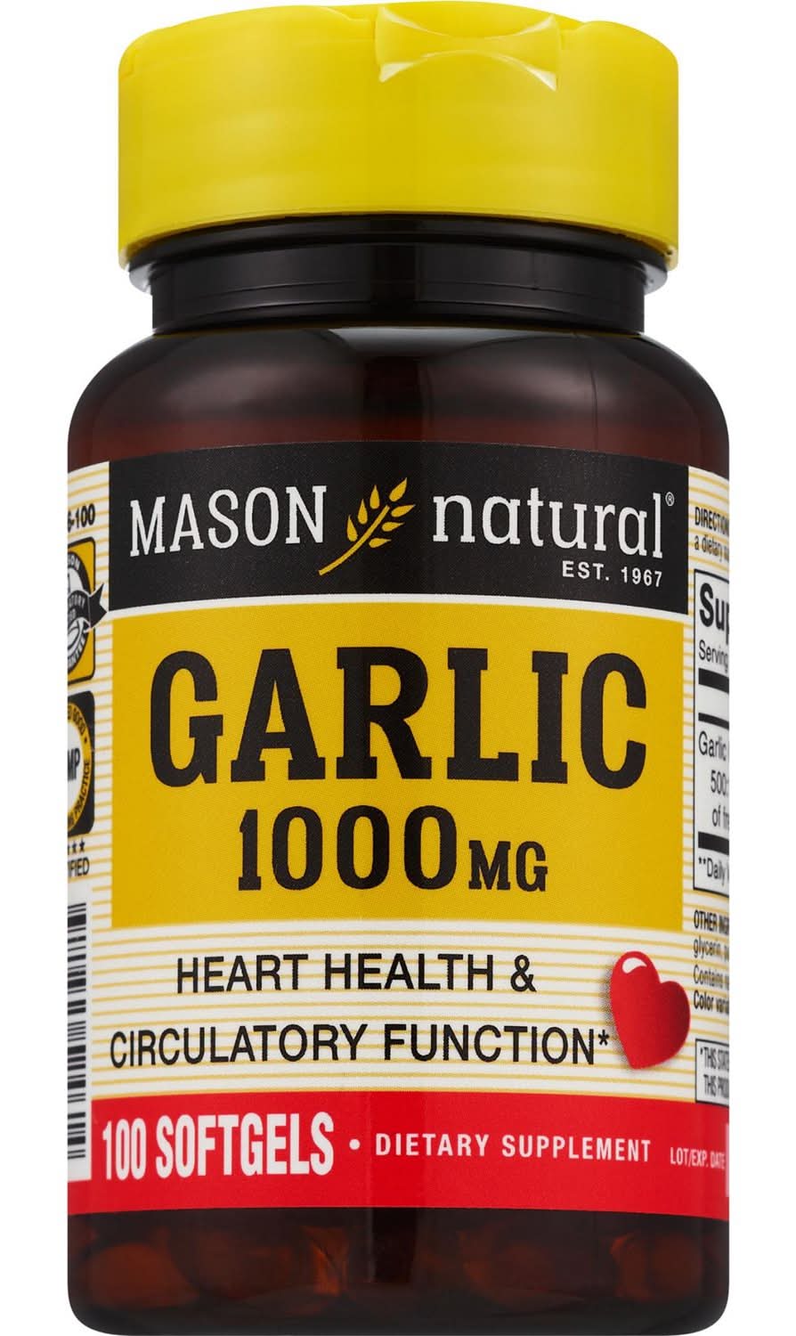 Mason Natural Garlic Oil 1000 mg softgels is a garlic supplement that is formulated with a high potency dose to help support normal, healthy cardiovascular function. Our garlic 1000 mg softgels contain a concentrated extract of allium sativum, the active compound in garlic. Guaranteed to have no added artificial colors of flavors, sweeteners, preservatives, sugar, starch, milk, lactose, wheat, yeast, fish, sodium. Garlic’s high concentration of sulfurous compounds may help support normal, healthy cholesterol levels and healthy blood clotting.
