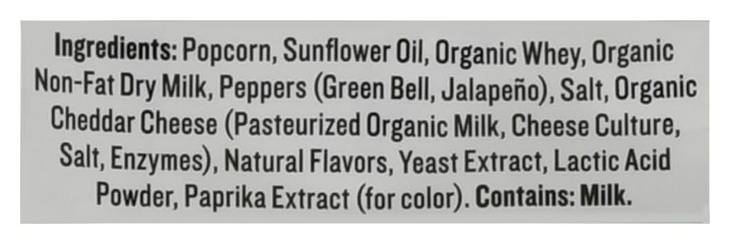 Ingredients: Popcorn, Sunflower Oil, Organic Whey, Organic Non-Fat Dry Milk, Peppers (Green Bell, Jalapeno), Salt, Organic Cheddar Cheese (Pasteurized Organic Milk, Cheese Culture, Salt, Enzymes), Natural Flavors, Yeast Extract, Lactic Acid Powder, Paprika Extract (for Color) Contains: Milk