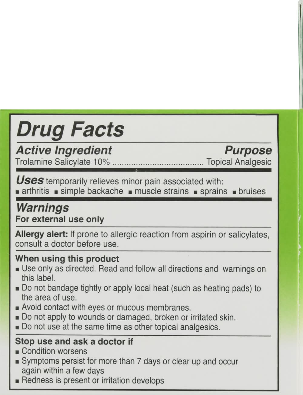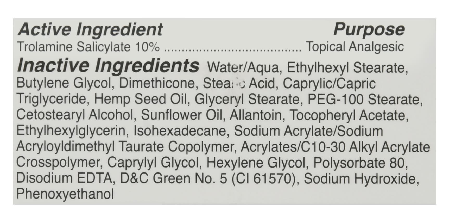 Ingredients: Ethylhexyl Stearate, Butylene Glycol, Dimethicone, Stearic Acid, Caprylic/Capric Triglyceride, Hemp Seed Oil, Glyceryl Stearate, PEG-100 Stearate, Cetostearyl Alcohol, Sunflower Oil, Allantoin, Tocopheryl Acetate, Ethylhexylglycerin, Isohexadecane, Sodium Acrylate/Sodium Acryloyldimethyl Taurate Copolymer, Acrylates/C10-30 Alkyl Acrylate Crosspolymer, Caprylyl Glycol, Hexylene Glycol, Polysorbate 80, Disodium EDTA, D&C Green 5 CI 61570, Sodium Hydroxide, Phenoxyethanol., Trolamine Salicylate 10 %