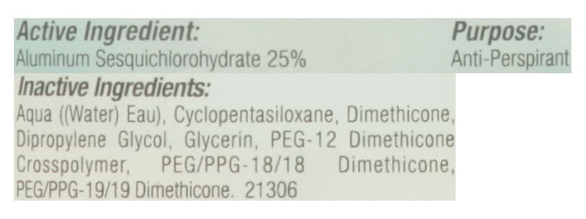 Ingredients: Active Ingredients: Aluminum Sesquichlorohydrate (25 %), Anti-Perspirant. Inactive Ingredients: Aqua (Water, Eau), Cyclopentasiloxane, Dimethicone, Dipropylene Glycol, Glycerin, PEG-12, Dimethicone Crosspolymer, PEG/PPG-18/18 Dimethicone, PEG/PPG-19/19 Dimethicone