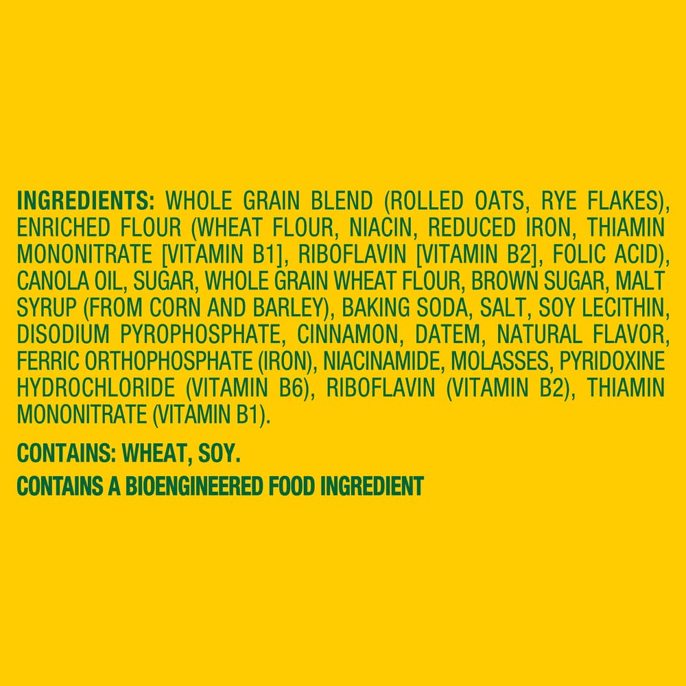 Ingredients: INGREDIENTS: WHOLE GRAIN BLEND (ROLLED OATS, RYE FLAKES), ENRICHED FLOUR (WHEAT FLOUR, NIACIN, REDUCED IRON, THIAMIN MONONITRATE [VITAMIN B1], RIBOFLAVIN [VITAMIN B2], FOLIC ACID), CANOLA OIL, SUGAR, WHOLE GRAIN WHEAT FLOUR, BROWN SUGAR, MALT SYRUP (FROM CORN AND BARLEY), BAKING SODA, SALT, SOY LECITHIN, DISODIUM PYROPHOSPHATE, CINNAMON, DATEM, NATURAL FLAVOR, FERRIC ORTHOPHOSPHATE (IRON), NIACINAMIDE, MOLASSES, PYRIDOXINE HYDROCHLORIDE (VITAMIN B6), RIBOFLAVIN (VITAMIN B2), THIAMIN MONONITRATE (VITAMIN B1), . CONTAINS: WHEAT, SOY. Contains: CONTAINS: WHEAT, SOY.