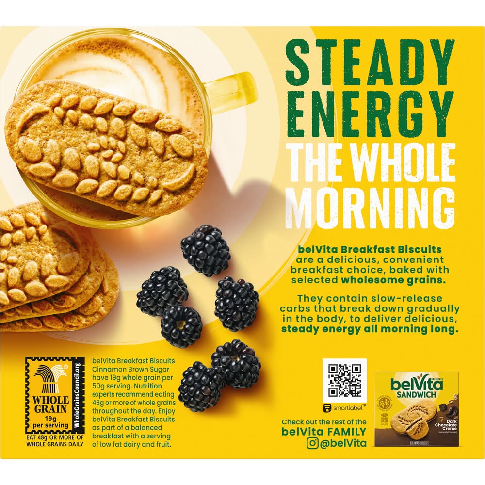 Start your morning off right with lightly sweet and crunchy belVita Cinnamon Brown Sugar Breakfast Biscuits. These bulk biscuits combine wholesome grains with the taste of cinnamon sugar for a delicious breakfast. Specially baked, these baked biscuits contain slow-release carbs that break down gradually in the body to deliver delicious, steady energy all morning long so you can enjoy these with your morning coffee, yogurt and fruit or as an instant breakfast food no matter what the morning brings. Each 50 gram serving of these bulk breakfast cookies contains 19 grams of whole grain, 2 grams of fiber and B vitamins for a delicious alternative to breakfast bars. A simple addition to your morning, these cholesterol-free bulk biscuits for breakfast contain no high-fructose corn syrup and no artificial colors, flavors or sweeteners. These convenient breakfast biscuits made with wholesome grains are a great alternative to traditional breakfast snacks. This bulk breakfast food is also an energizing alternative to snack bars and a wholesome addition to college care packages. Each individual pack contains four belVita Cinnamon Brown Sugar Biscuits for you to enjoy on the go, at the office or at home for lasting morning energy. • Flavor: Cinnamon brown sugar • Mondelez, East Hanover, NJ 07936 • Packaging: Reusable