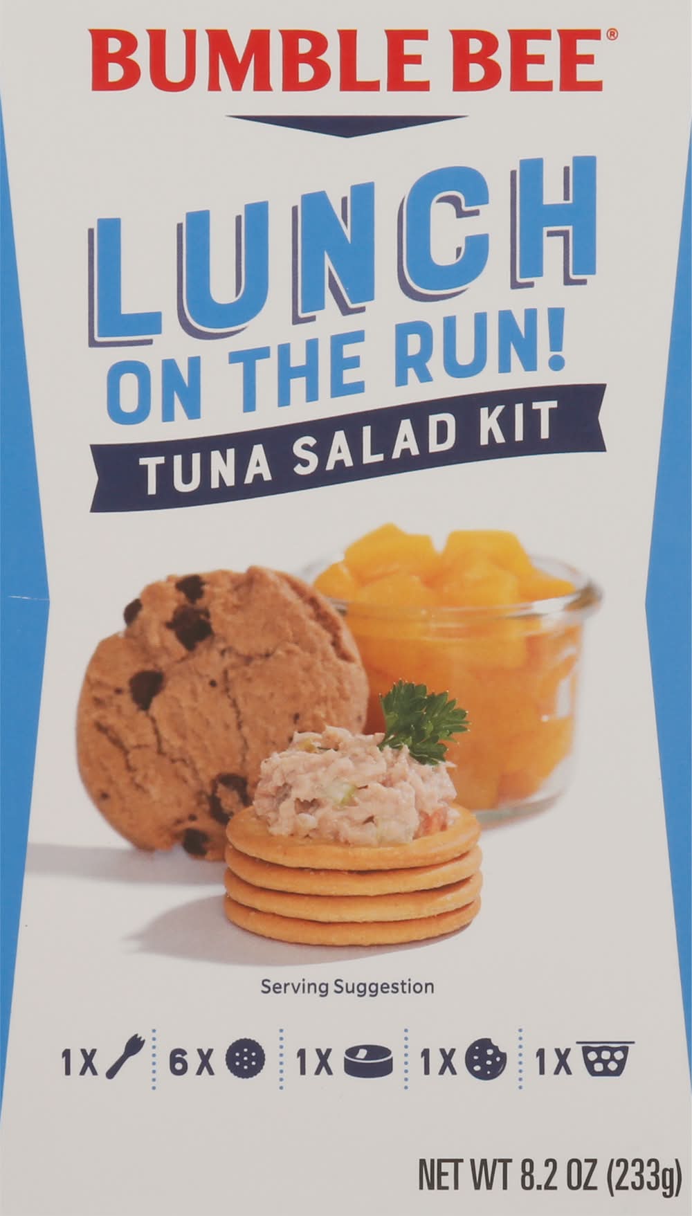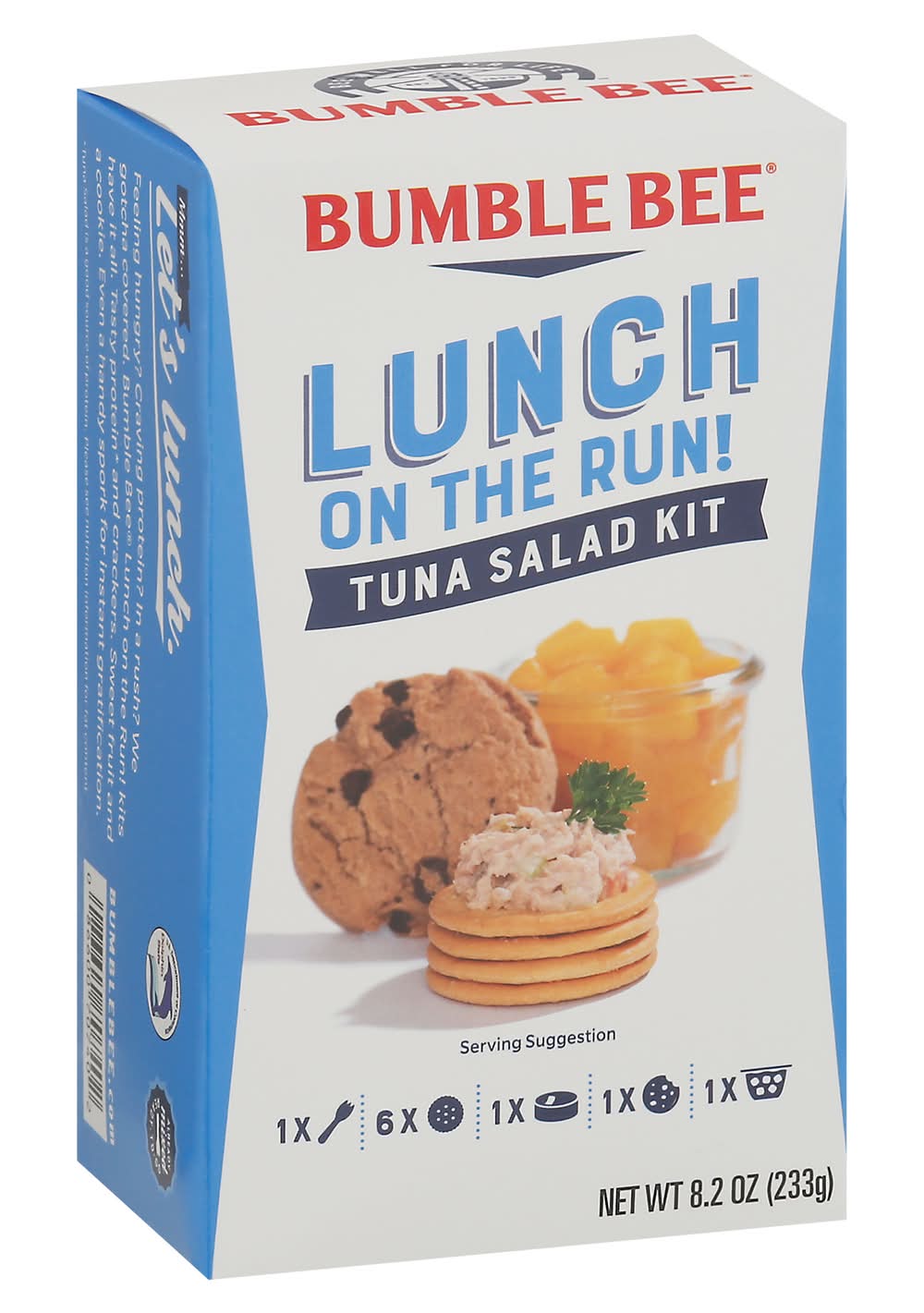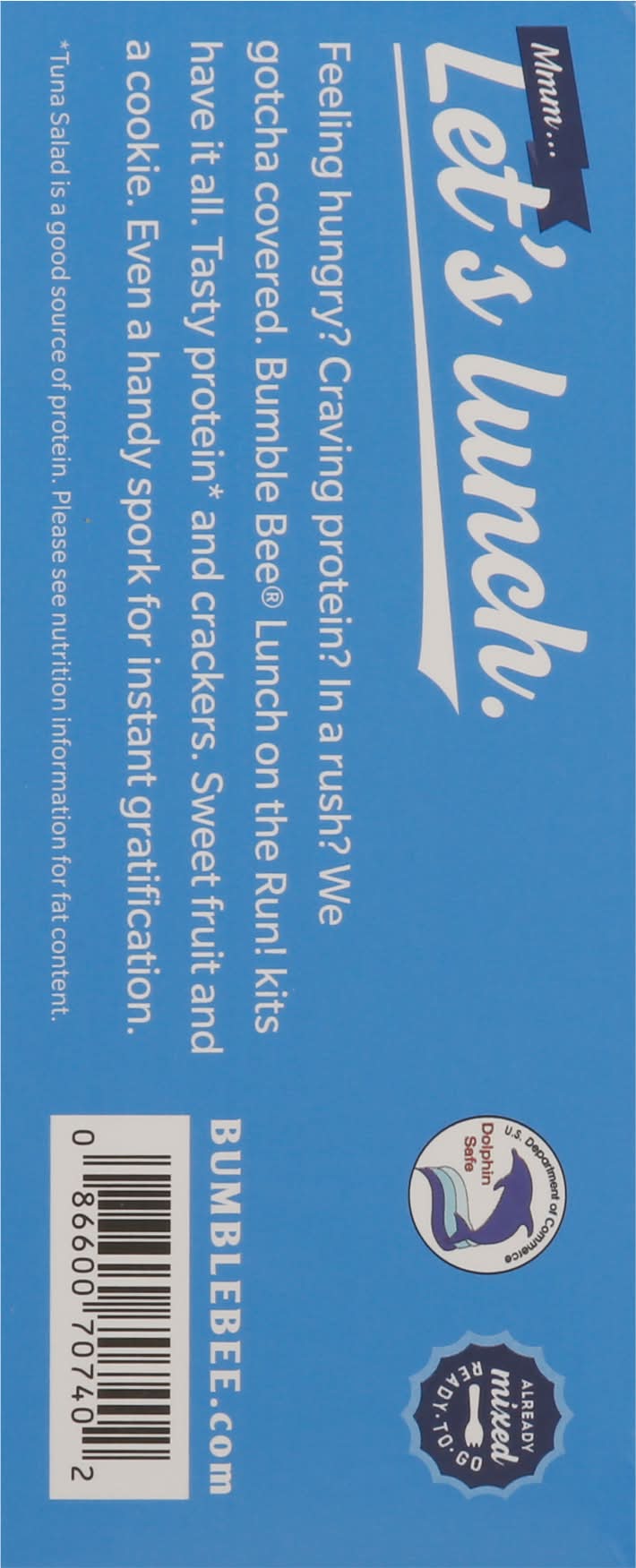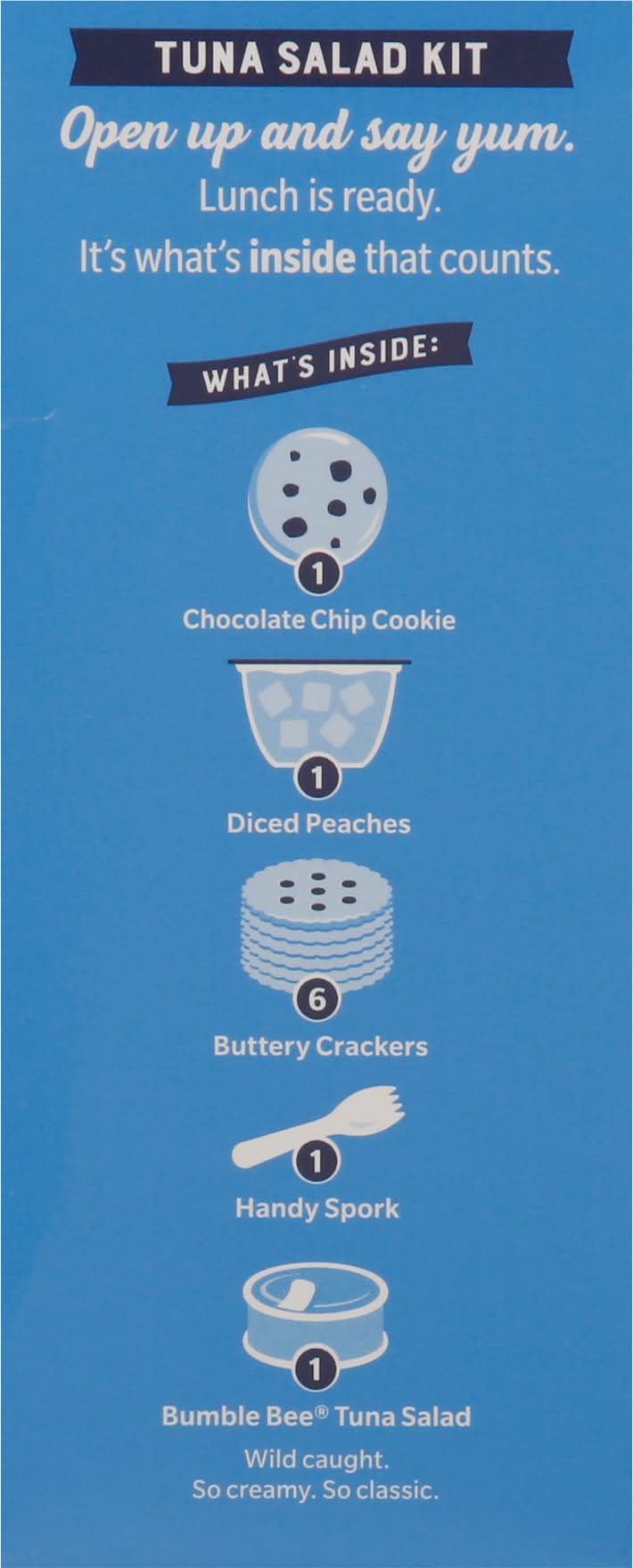 Contains bioengineered food ingredients. Bee well for life. Est. 1899. Mmm. Let's lunch. Feeling hungry? Craving protein? In a rush? We gotcha covered. Bumble Bee lunch on the run! Kits have it all. Tasty protein (Tuna salad is a good source of protein. Please see nutrition information for fat content) and crackers. Sweet fruit and a cookie. Even a handy spork for instant gratification. Already mixed. Ready to go. Tuna Salad Kit: Open up and say yum. Lunch is ready. It's what's inside that counts. What's inside: 1 Chocolate chip cookie; 1 Diced peaches; 6 Buttery crackers; 1 Handy spork; 1. Bumble Bee Tuna Salad. So creamy. So classic. Dolphin safe. bumblebee.com. For inquiries concerning product, include number shown on carton and can end. Tuna Salad: US Department of Commerce: Dolphin safe. Crackers: US Department of Commerce: Dolphin safe. Cookie: US Department of Commerce: Dolphin safe. Diced Peaches: US Department of Commerce: Dolphin safe. Lunch Kit Totals: US Department of Commerce: Dolphin safe. Assembled in the USA. Tuna product of the Thailand.