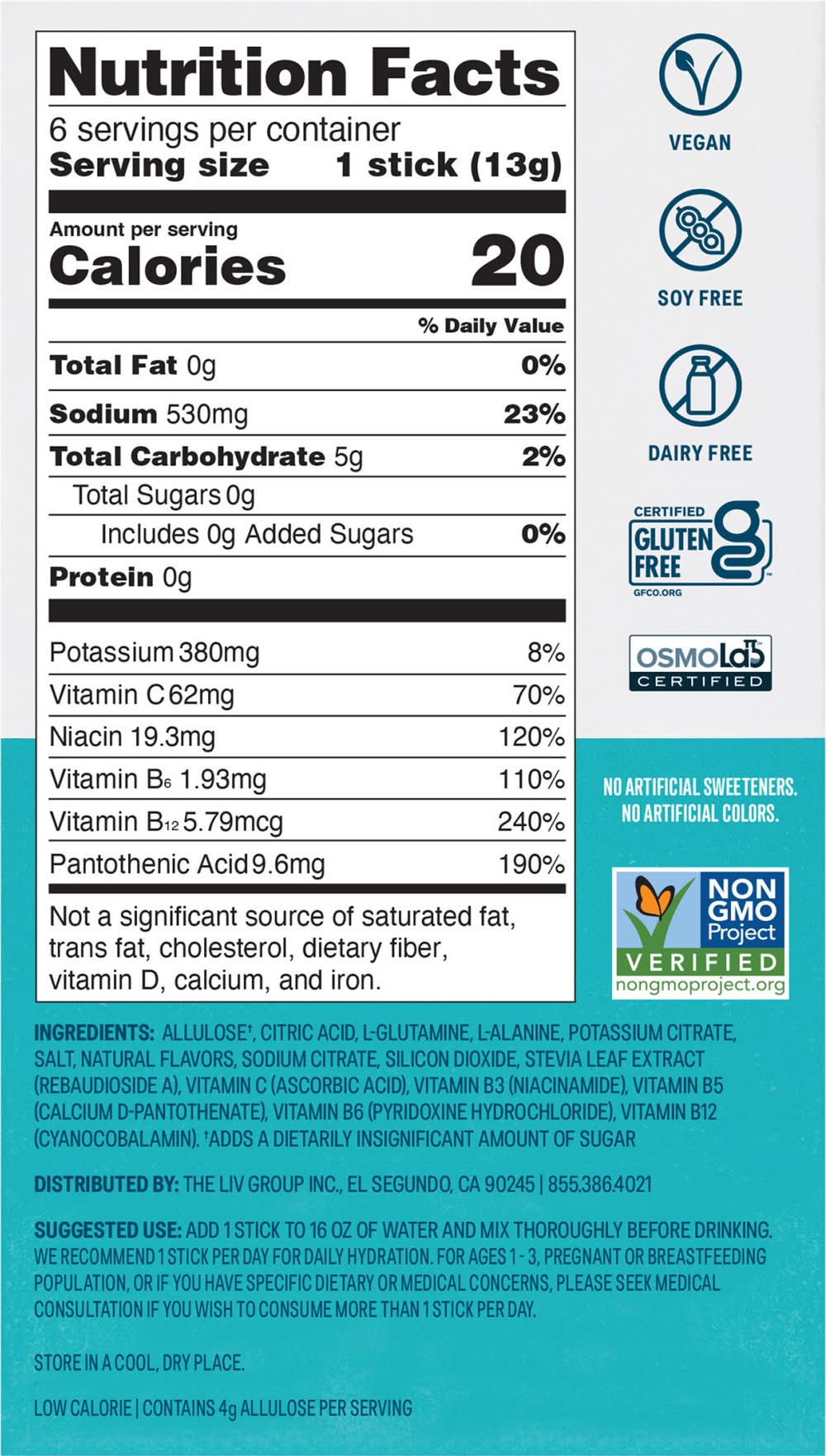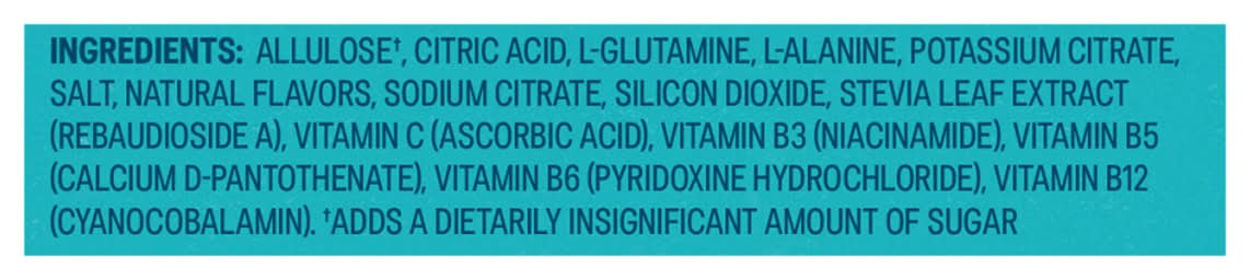 Ingredients: Allulose*, Citric Acid, L-Glutamine, L-Alanine, Potassium Citrate, Salt, Natural Flavors, Sodium Citrate, Silicon Dioxide, Stevia Leaf Extract (Rebaudioside A), Vitamin C (Ascorbic Acid), Malic Acid, Vitamin B3 (Niacinamide), Vitamin B5 (Calcium D-Pantothenate), Vitamin B6 (Pyridoxine Hydrochloride), Vitamin B12 (Cyanocobalamin)