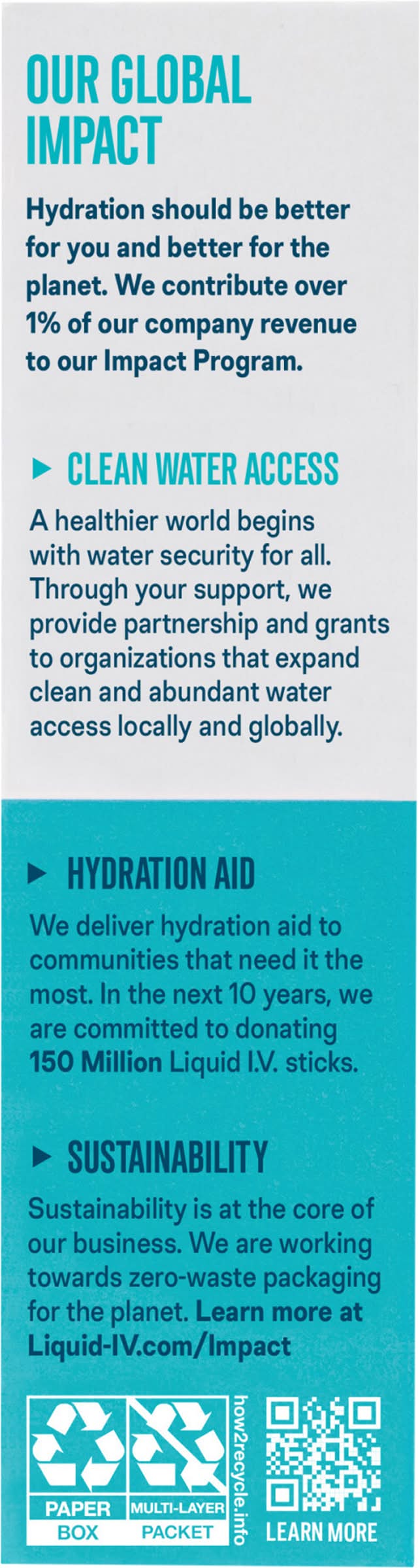 Hydration Multiplier® is a great-tasting, non-GMO electrolyte drink mix powered by LIV HYDRASCIENCE™ to deliver hydration faster than water alone. Our formula is designed with an optimized ratio of electrolytes and clinically tested nutrients to turn ordinary water into extraordinary hydration. Scientifically formulated to quickly replenish electrolytes & fluids lost from sweat or exercise. Hydration Multiplier® has 3x the electrolytes of the leading sports drink, 8 vitamins and nutrients, and 100% of the daily value of 4 B vitamins: B3, B5, B6 and B12. Experience hydration for mental clarity, physical endurance, and overall wellbeing. HYDRATION MIX: Hydration Multiplier® Sugar-Free is a great-tasting, non-GMO electrolyte drink that delivers superior hydration than water alone. GREAT TASTE: Sugar-Free Lemon Lime is zesty and bright, with a punch of citrus flavor. SCIENCE-BACKED FORMULA: Powered by our proprietary Amino Acid Allulose Blend, our innovative hydration solution with 0 sugar and 0 artificial sweeteners. EXTRAORDINARY HYDRATION: Hydration Multiplier® Sugar-Free is made with our proprietary Amino Acid Allulose Blend. It has 3x the electrolytes of the leading sports drink, and 8 vitamins and nutrients. Gluten-free, soy-free, and dairy-free. CONVENIENCE: Single-serving, travel-friendly packets are easy to enjoy on the go. Pour one easy-to-open packet into 16 oz of water, mix or shake, and hydrate. HYDRATION AID: Since 2015, we have donated over 55 million servings of Liquid I.V.® to those in need around the globe, and donate over 1% of our revenue to our Impact programs. • Flavor: Lemon lime • Pack size: 6 • Packaging: Reusable