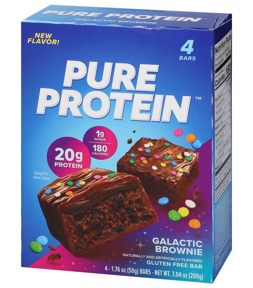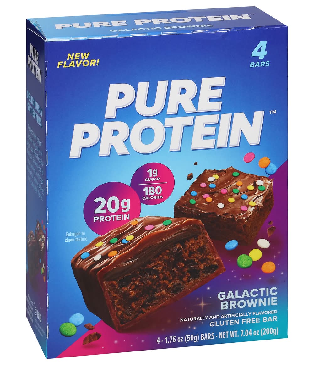 Pure Protein Galactic Brownie Bars are delicious, high-protein snacks with high-quality protein that supports building lean muscle and strength. These Galactic Brownie protein bars contain whey protein isolate, and are gluten free. Each protein bar contains 20 grams of protein, 200 calories, and 2 grams of sugar, to support your busy and active lifestyle and help you to build lean muscle. Grab a Pure Protein bar for high-quality protein, an essential part of a nutritious, balanced diet. With delicious Galactic Brownie flavor, these high protein bars are a treat at any time of day. Whether you prefer protein bars pre-workout, post-workout, or on-the-go, Pure Protein is proud to offer you high-protein snack bars with low sugar and great taste that you’ll love. • Flavor: Galactic brownie • Pack size: 4