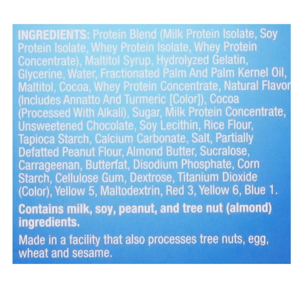 Ingredients: Protein Blend (Milk Protein Isolate, Soy Protein Isolate, Whey Protein Isolate, Whey Protein Concentrate), Maltitol Syrup, Hydrolyzed Gelatin, Glycerine, Water, Fractionated Palm and Palm Kernel Oil, Maltitol, Cocoa, Whey Protein Concentrate, Natural Flavor (Includes Annatto and Turmeric [Color]), Cocoa (Processed with Alkali), Sugar, Milk Protein Concentrate, Unsweetened Chocolate, Soy Lecithin, Rice Flour, Tapioca Starch, Calcium Carbonate, Salt, Partially Defatted Peanut Flour, Almond Butter, Sucralose, Carrageenan, Butterfat, Disodium Phosphate, Corn Starch, Cellulose Gum, Dextrose, Titanium Dioxide (Color), Yellow 5, Maltodextrin, Red 3, Yellow 6, Blue 1 Contains: Milk, Soybeans, Peanuts, Tree Nuts, Almonds, Corn, Tree Nuts, Eggs, Wheat, Sesame Additives: Artificial Flavors, Genetically Modified Ingredients
