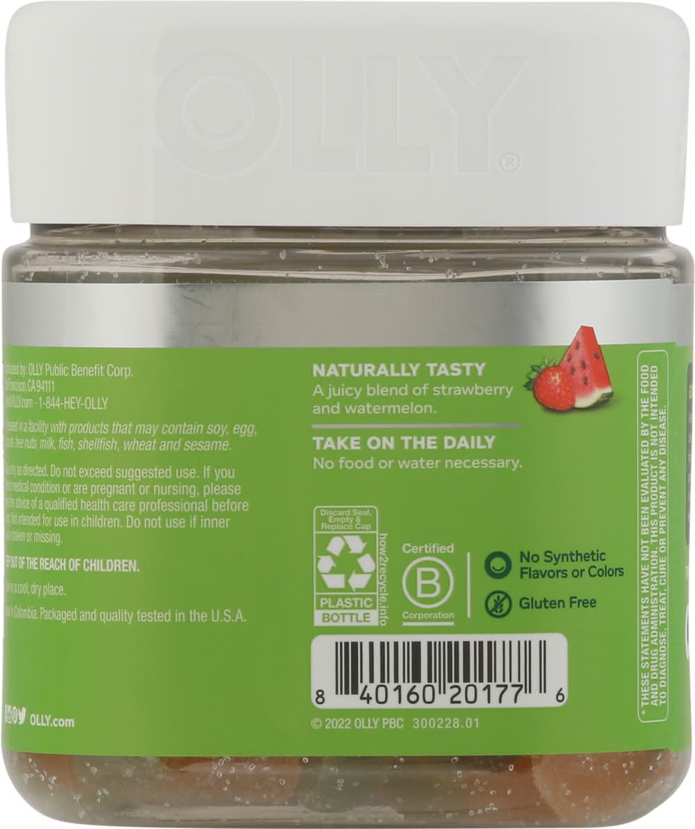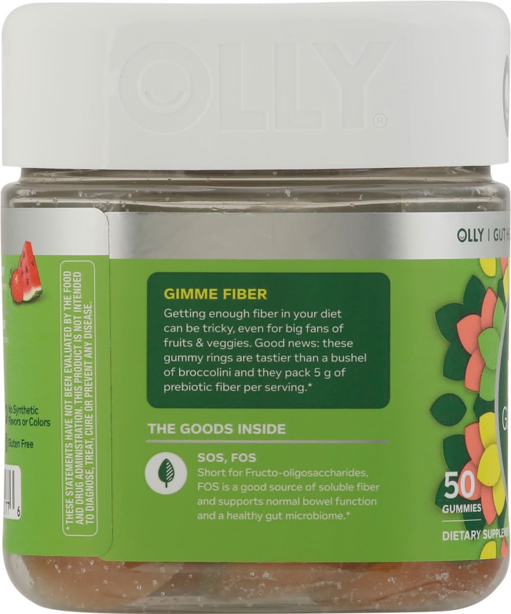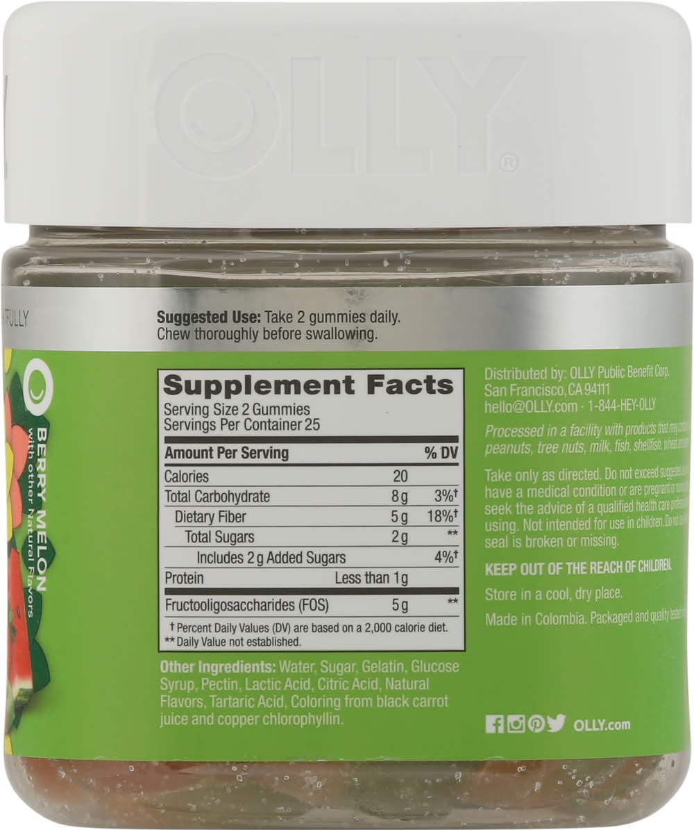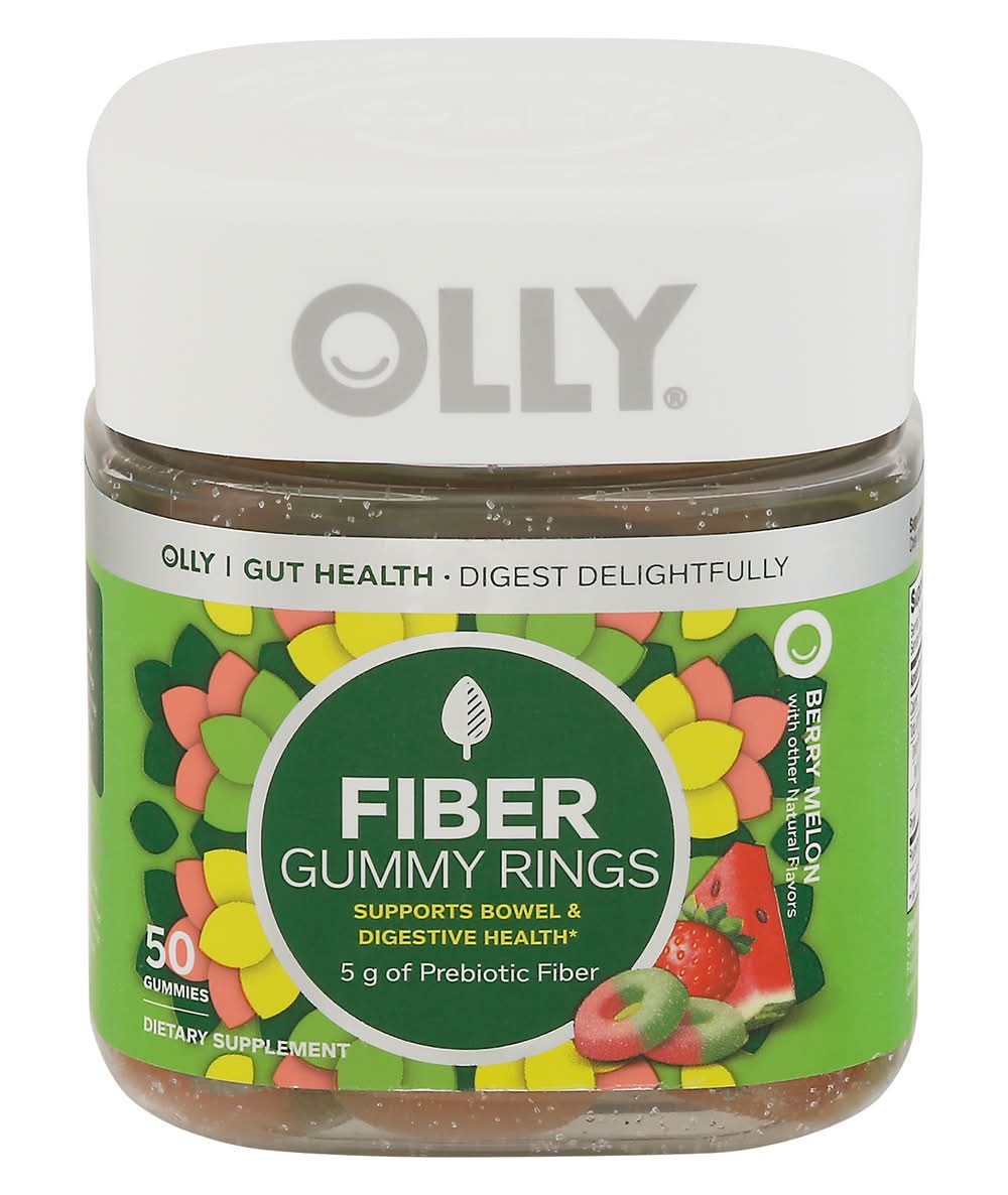OLLY berry melon flavor Fiber Gummy Rings are a fabulously fruity way to support bowel and digestive health.* The goods inside: Fructo-oligosaccharides, or FOS for short, is a good source of soluble fiber and supports normal bowel function and a healthy gut microbiome.* Getting enough fiber in your diet can be tricky, even for the biggest fans of fruits & veggies. But with their juicy blend of strawberry and watermelon, these gummy rings deliver fiber with flavor. Not only are they tastier than a bushel of broccolini, they also pack 5 g of Prebiotic fiber into every serving. Adults, take 2 gummies daily. Chew thoroughly before swallowing.At OLLY, good health is at the center of everything we do. We make delightful vitamins and supplements with real-deal benefits that help you live Happy Inside Out.**These statements have not been evaluated by the Food and Drug Administration. This product is not intended to diagnose, treat, cure or prevent any disease. OLLY FIBER GUMMY RINGS: Getting enough fiber in your diet can be tricky, even for big fans of fruits & veggies. These delicious gummies pack 5 g of Prebiotic fiber into every serving to help support bowel and digestive health.* THE GOODS INSIDE: Fructo-oligosaccharides, or FOS for short is a good source of the soluble fiber your body needs to maintain bowel health.* DELIVERS FIBER WITH FLAVOR: Juicy blend of strawberry and watermelon, packs 5 g of Prebiotic fiber into every serving. HOW TO TAKE: Adults, take 2 gummies daily. Chew thoroughly before swallowing. GUMMY GOODNESS: Our irresistibly chewable berry melon flavor fiber rings deliver the fiber you need without artificial flavors or colors—and they’re gluten-free. HEAD TO TOE HAPPY: We’ve got supplements to keep you tip-top from head to toe—browse the benefits from Sleep support to nutrient-packed Multivitamins, and find the OLLY routine that fits you and your crew. Packaging: Reusable
