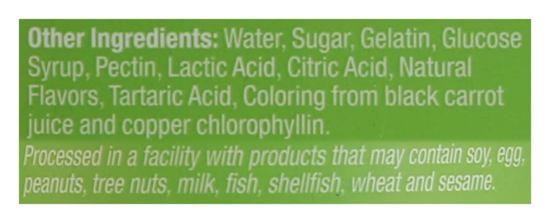 Ingredients: Other Ingredients: Water, Sugar, Gelatin, Glucose Syrup, Pectin, Lactic Acid, Citric Acid, Natural Flavors, Tartaric Acid, Coloring from Black Carrot Juice and Copper Chlorophyllin. Contains: Soybeans, Eggs, Peanuts, Tree Nuts, Milk, Fish, Crustacean Shellfish, Wheat, Sesame