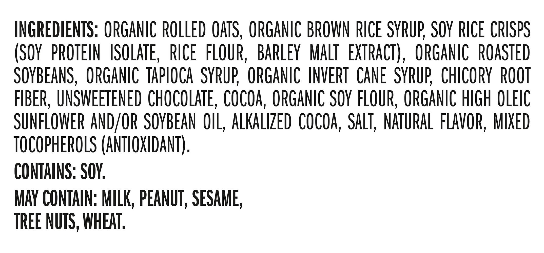 Ingredients: INGREDIENTS: ORGANIC ROLLED OATS, ORGANIC BROWN RICE SYRUP, SOY RICE CRISPS (SOY PROTEIN ISOLATE, RICE FLOUR, BARLEY MALT EXTRACT), ORGANIC ROASTED SOYBEANS, ORGANIC TAPIOCA SYRUP, ORGANIC INVERT CANE SYRUP, CHICORY ROOT FIBER, UNSWEETENED CHOCOLATE, COCOA, ORGANIC SOY FLOUR, ORGANIC HIGH OLEIC SUNFLOWER AND, OR SOYBEAN OIL, ALKALIZED COCOA, SALT, NATURAL FLAVOR, MIXED TOCOPHEROLS (ANTIOXIDANT), . CONTAINS: SOY. MAY CONTAIN: MILK, PEANUT, SESAME, TREE NUTS, WHEAT. Contains: CONTAINS: SOY. MAY CONTAIN: MILK, PEANUT, SESAME, TREE NUTS, WHEAT.