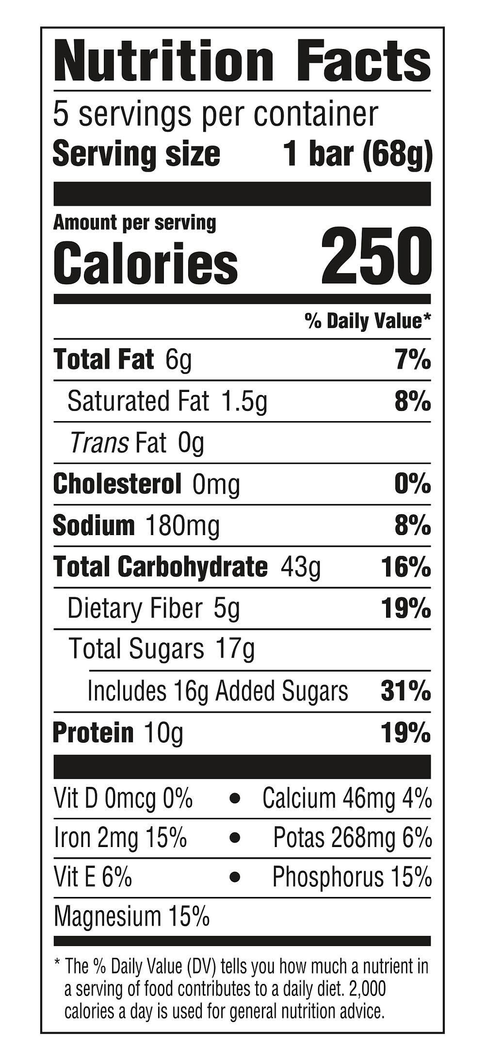 Energy bars are made with quality ingredients like wholesome organic rolled oats and no high-fructose corn syrup, and they are non-GMO and plant-based for a granola bar you can feel good about. As part of the brand mission, our 2 LEED certified bakeries and Emeryville, CA office run with the help of on-site solar arrays and/or offset electricity through the purchase of renewable energy credits (RECs). From Energy Bars to Builders Protein Bars and Snack Bars, our brands turn grabbing a bar into raising your bar. • Flavor: Chocolate brownie • Pack size: 5 • Mondelez Global Llc, East Hanover,NJ-07936 • Packaging: Reusable