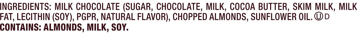 Ingredients: MILK CHOCOLATE (SUGAR, CHOCOLATE, MILK, COCOA BUTTER, SKIM MILK, MILK FAT, LECITHIN (SOY), PGPR, NATURAL FLAVOR), CHOPPED ALMONDS, SUNFLOWER OIL. Contains: Contains: Almonds, Soy, Milk