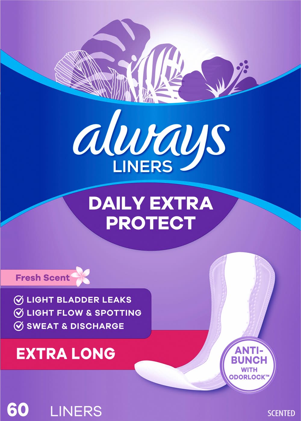 Liners, Daily Extra Protect, Extra Long, Fresh Scent • Procter & Gamble, Cincinnati,OH, 45202 • Packaging: Reusable