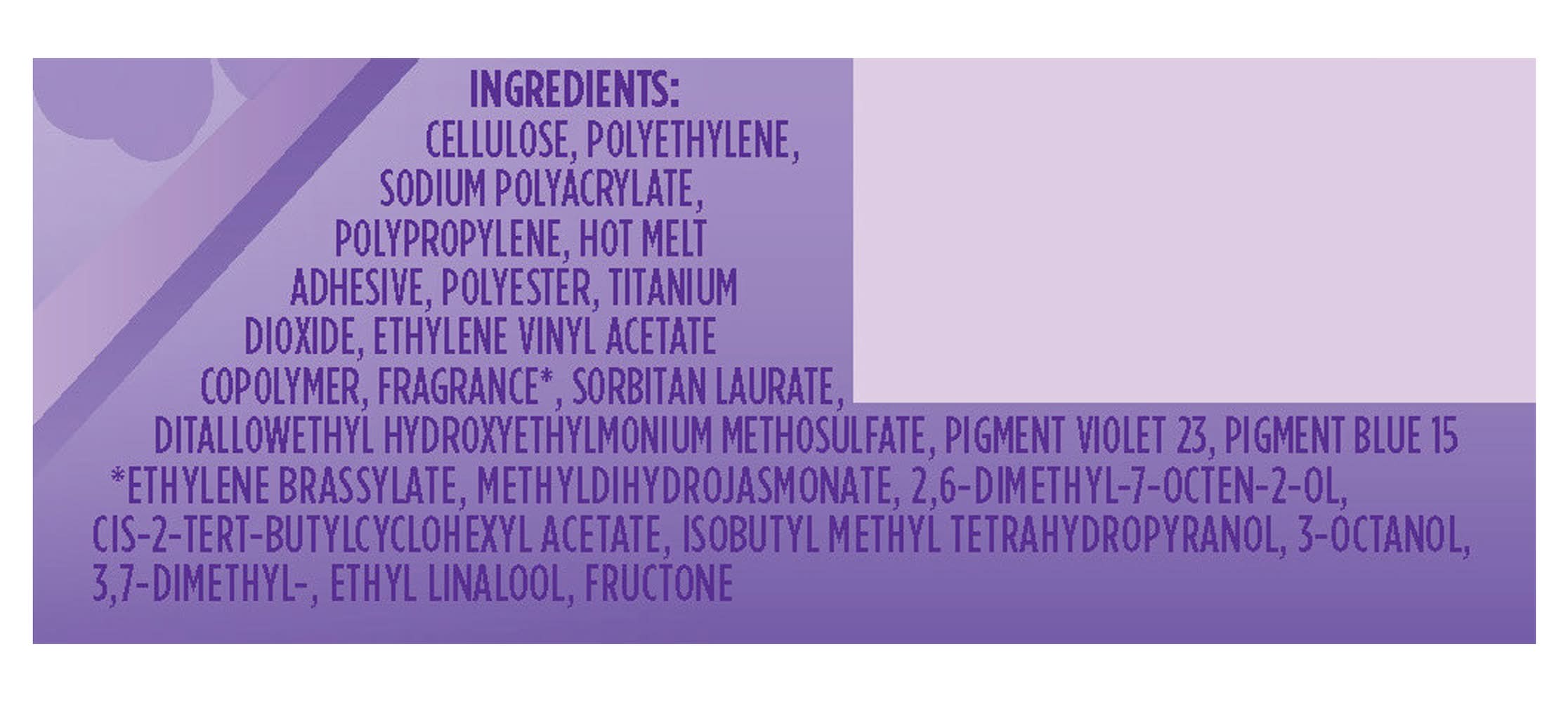 Ingredients: Cellulose, Polyethylene, Sodium Polyacrylate, Polypropylene, Hot Melt Adhesive, Polyester, Titanium Dioxide, Ethylene Vinyl Acetate Copolymer, Fragrance*, Sorbitan Laurate, Ditallowethyl Hydroxyethylmonium Methosulfate, Pigment Violet 23, Pigment Blue 15 * Ethylene Brassylate, Methyldihydrojasmonate, 2.6-Dimethyl-7-Octen-2-Ol, Cis-2-Tert-Butylcyclohexyl Acetate, Isobutyl Methyl Tetrahydropyranol, 3-Octanol, 3.7-Dimethyl-, Ethyl Linalool, Fructone
