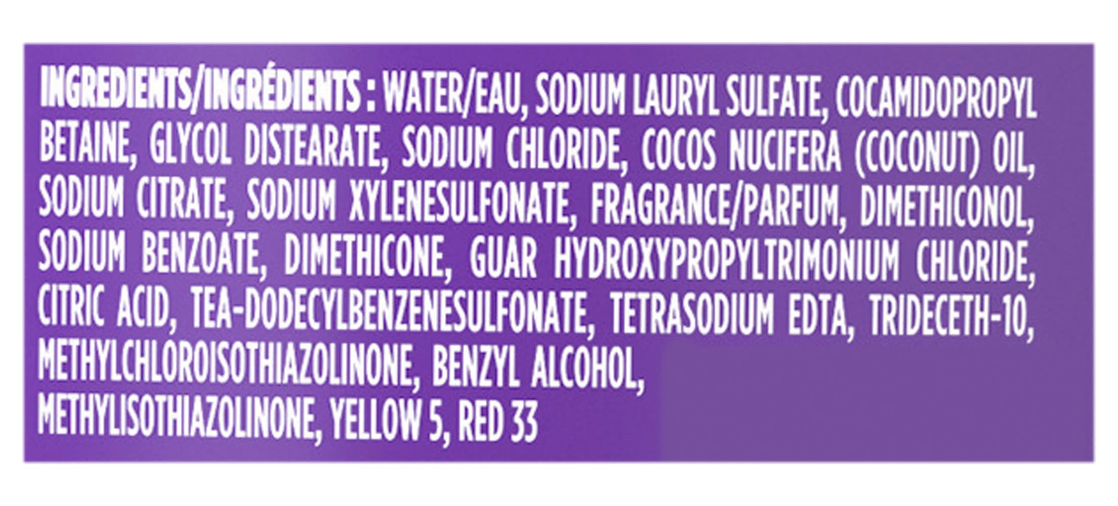 Ingredients: Water/Eau, Sodium Lauryl Sulfate, Cocamidopropyl Betaine, Glycol Distearate, Sodium Chloride, Cocos Nucifera (Coconut) Oil, Sodium Citrate, Sodium Xylenesulfonate, Fragrance/Parfum, Dimethiconol, Sodium Benzoate, Dimethicone, Guar Hydroxypropyltrimonium Chloride, Citric Acid, TEA-Dodecylbenzenesulfonate, Tetrasodium EDTA, Trideceth-10, Methylchloroisothiazolinone, Benzyl Alcohol, Methylisothiazolinone, Yellow 5, Red 33 Contains: Tree Nuts