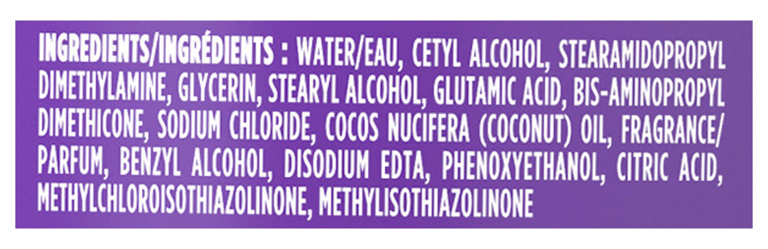 Ingredients: Water/Eau, Cetyl Alcohol, Stearamidopropyl Dimethylamine, Glycerin, Stearyl Alcohol, Glutamic Acid, Bis-Aminopropyl Dimethicone, Sodium Chloride, Cocos Nucifera (Coconut) Oil, Fragrance/Parfum, Benzyl Alcohol, Disodium EDTA, Phenoxyethanol, Citric Acid, Methylchloroisothiazolinone, Methylisothiazolinone Contains: Tree Nuts