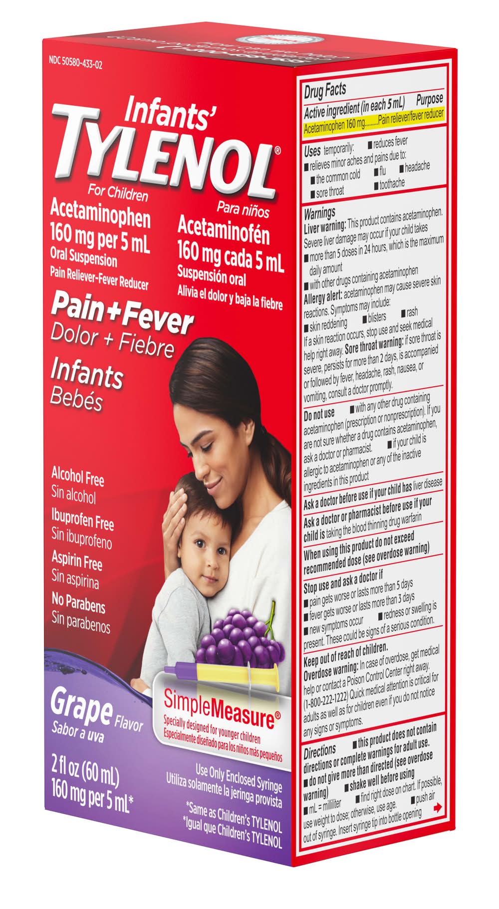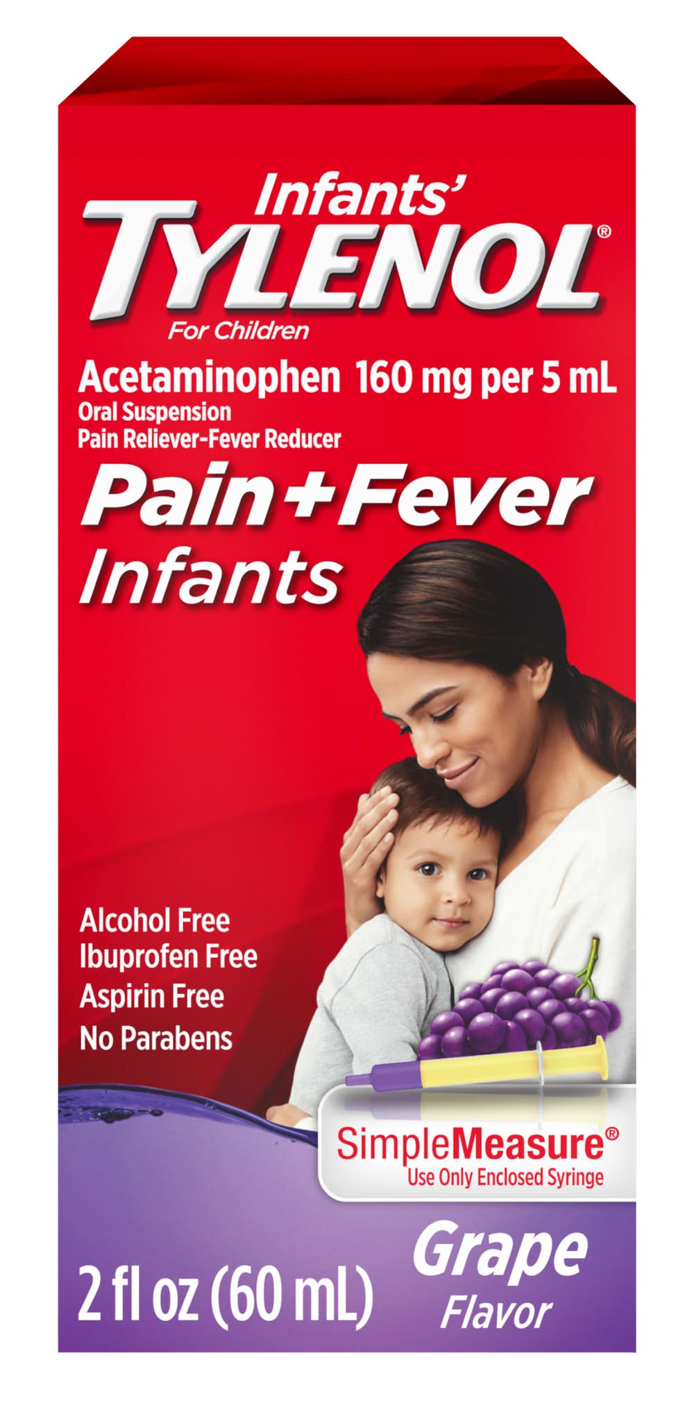 Infants' Tylenol Oral Suspension provides temporary pain relief from your child's minor aches and pains due to the common cold, flu, sore throat, headache, toothache. This liquid medicine is also formulated to temporarily reduce fever and starts working to relieve symptoms in as little as 15 minutes. Each 5-milliliter dose contains 160 milligrams of acetaminophen, a known pain reliever and fever reducer. Infants' Tylenol is the #1 pediatrician-recommended brand for infant teething pain, is ibuprofen-, aspirin- and alcohol-free, and is gentle on little tummies with a kid-friendly grape flavor. It includes a SimpleMeasure syringe with dosing for children 2 to 3 years of age. For dosing information for children under 2 years, ask your healthcare professional. Help provide relief for your infant with Tylenol, the #1 pediatrician-recommended brand of pain reliever and fever reducer. INFANTS' PAIN & FEVER REDUCER: Infants' Tylenol Liquid Oral Suspension with acetaminophen; Grape flavor; Temporarily relieves minor aches and pains due to the common cold and flu, sore throat, and toothaches. FEVER MEDICINE For INFANTS: Infant Tylenol oral suspension with acetaminophen can be used by children ages 2-3 years old; Infused with a grape flavor and is gentle on the tummy; Starts to reduce fever in as little as 15 minutes. ACETAMINOPHEN FORMULA: Tylenol baby pain and fever medicine is made with each 5 mL dose containing 160 mg of acetaminophen, which is a known pain and fever reducer. HOW TO USE: Find the right dosage on the Infants' Tylenol package for your infant's age & weight; Use the simple measure dosing syringe provided that is specifically designed for use with this product; Safe and effective when used as directed. INCLUDES: Pack of 1, 2 fl. oz Infants' Tylenol pain relief liquid; Grape flavor; Tylenol is the #1 pediatrician recommended brand for pain relief and fever reduction; Tylenol has been used by parents for decades.