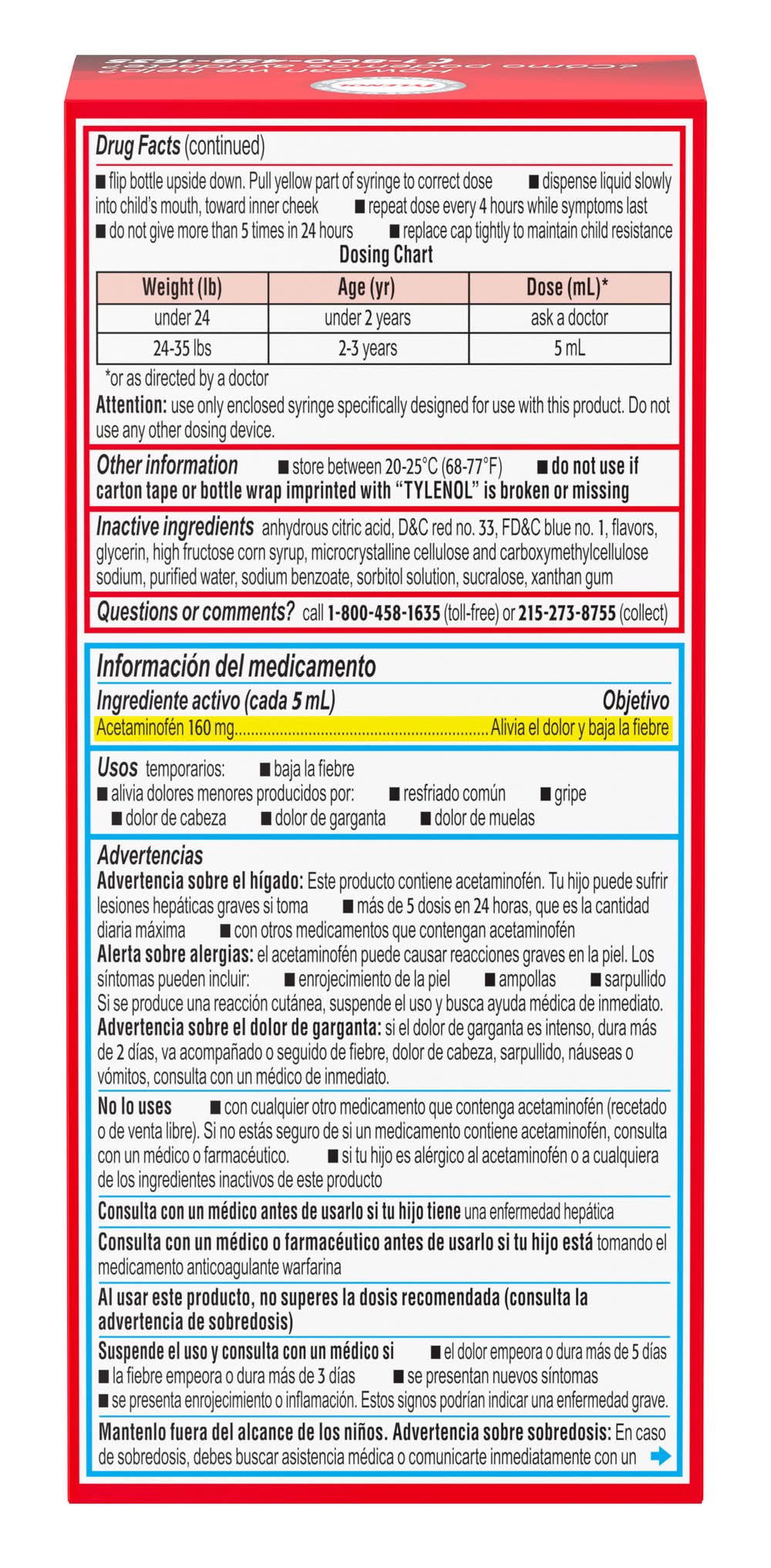 In each 5 ml: directions: this product does not contain directions or complete warnings for adult use. do not give more than directed (see overdose warning). shake well before using. ml=milliliter. find right dose on chart. if possible, use weight to dose; otherwise, use age. push air out of syringe. insert syringe tip into bottle opening. flip bottle upside down. pull yellow part of syringe to correct dose. dispense liquid slowly into child's mouth, toward inner cheek. repeat dose every 4 hours while symptoms last. do not give more than 5 times in 24 hours. replace cap tightly to maintain child resistance. attention: use only enclosed syringe specifically designed for use with this product. do not use any other dosing device. use only enclosed syringe. weight: under 24 lbs (under 2 years):: ask a doctor. weight: 24-35 lbs (2-3 years):: 5 ml (or as directed by a doctor). in each 5 ml: warnings: liver warning: this product contains acetaminophen. severe liver damage may occur if your child takes: more than 5 doses in 24 hours, which is the maximum daily amount; with other drugs containing acetaminophen. allergy alert: acetaminophen may cause severe skin reactions. symptoms may include:: skin reddening; blisters; rash. if a skin reaction occurs, stop use and seek medical help right away. sore throat warning: if sore throat is severe, persists for more than 2 days, is accompanied or followed by fever, headache, rash, nausea, or vomiting, consult a doctor promptly. do not use: with any other drug containing acetaminophen (prescription or nonprescription). if you are not sure whether a drug contains acetaminophen, ask a doctor or pharmacist; if your child is allergic to acetaminophen or any of the inactive ingredients in this product. ask a doctor before use if your child has liver disease. ask a doctor or pharmacist before use if your child is taking the blood thinning drug warfarin. when using this product do not exceed recommended dose (see overdose warning). stop use and ask a doctor if: pain gets worse or lasts more than 5 days; fever gets worse or lasts more than 3 days; new symptoms occur; redness or swelling is present. these could be signs of a serious condition. keep out of reach of children. overdose warning: in case of overdose, get medical help or contact a poison control center right away. (1-800-222-1222) quick medical attention is critical for adults as well as for children even if you do not notice any signs or symptoms.