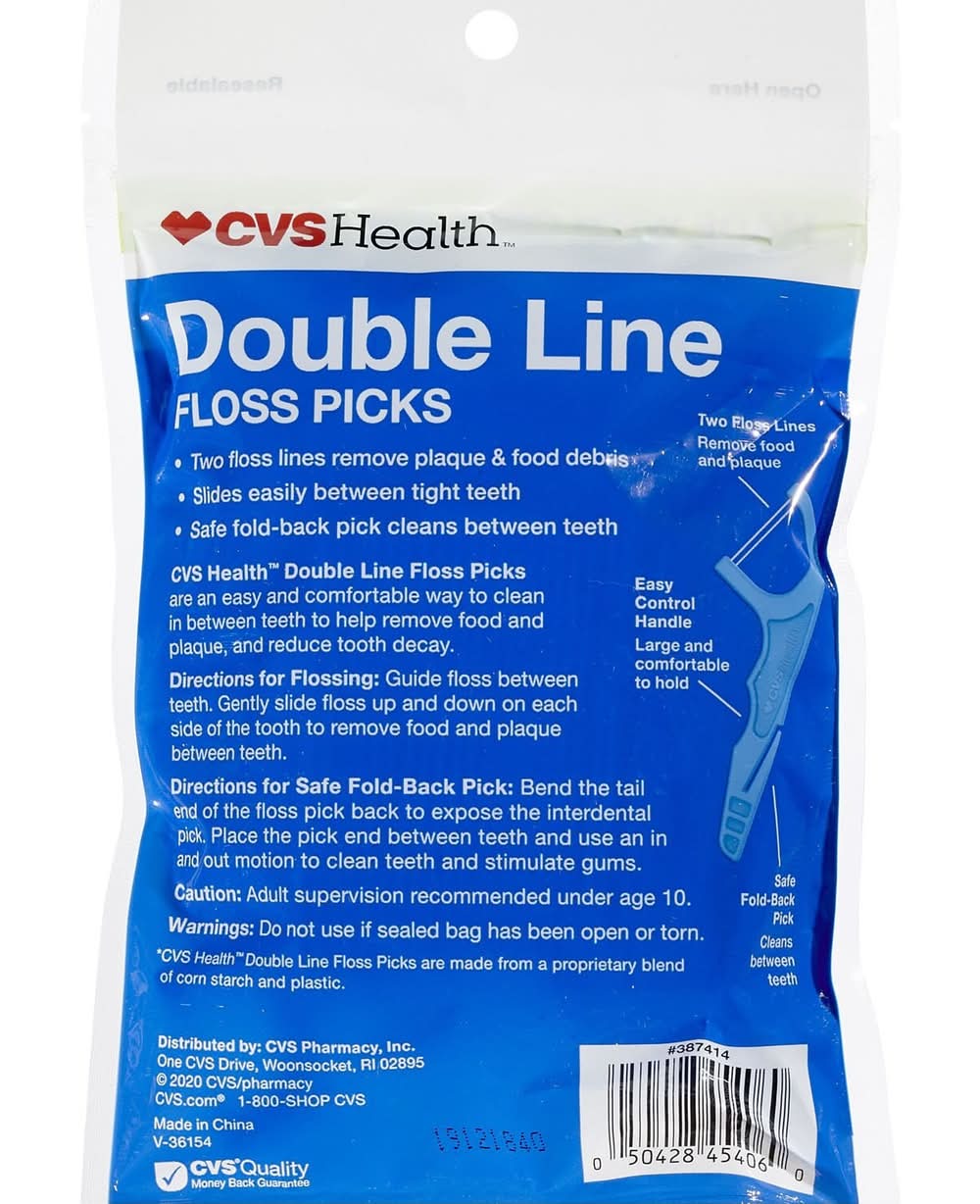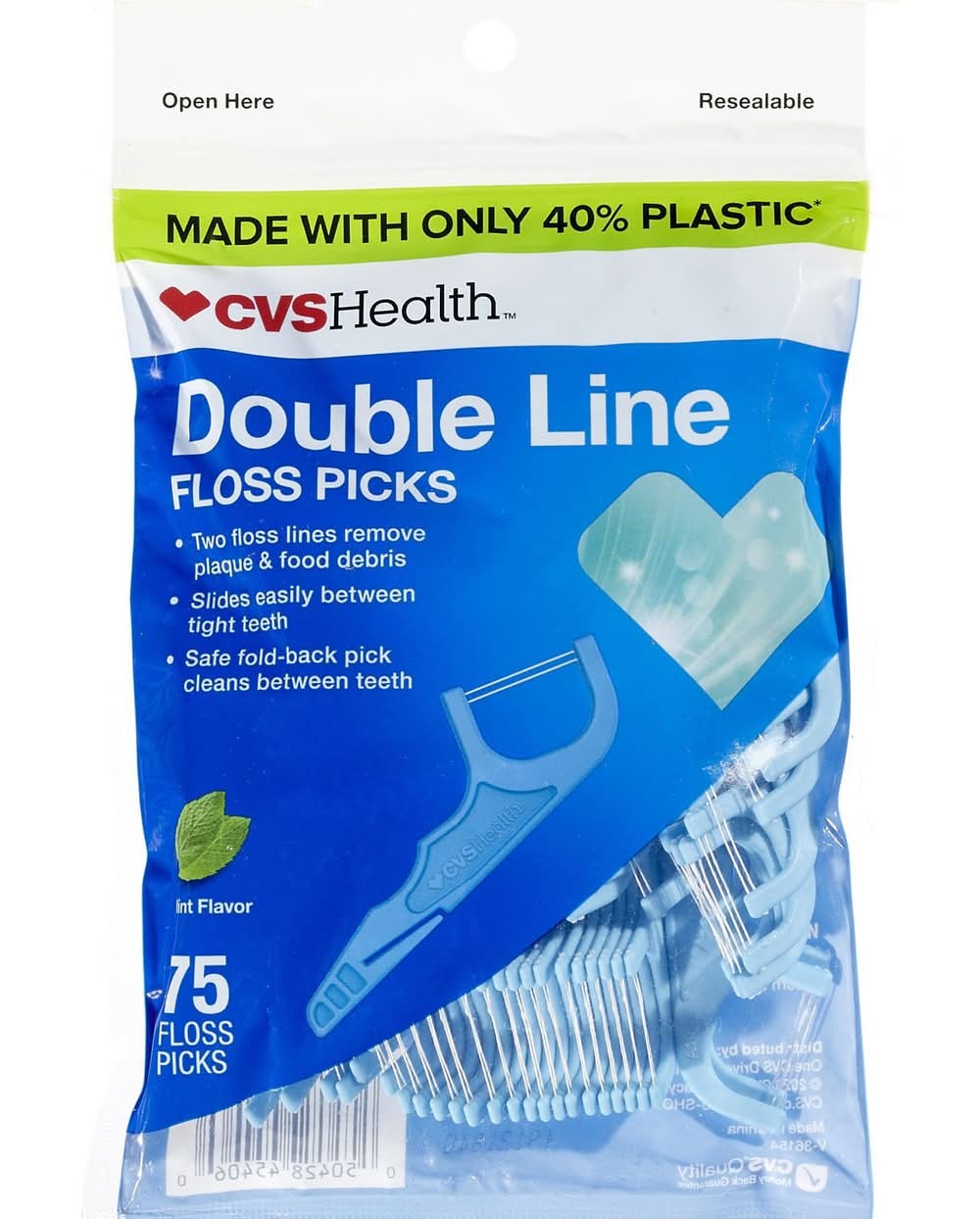 CVS Health Double Line Floss Picks are designed with two floss lines to effectively remove plaque and food particles from between teeth. Their slim profile allows for easy insertion into tight spaces. Each pick also features a fold-back cleaning tool to provide additional dental hygiene support. These floss picks are infused with a mint flavor to leave your mouth feeling fresh.
