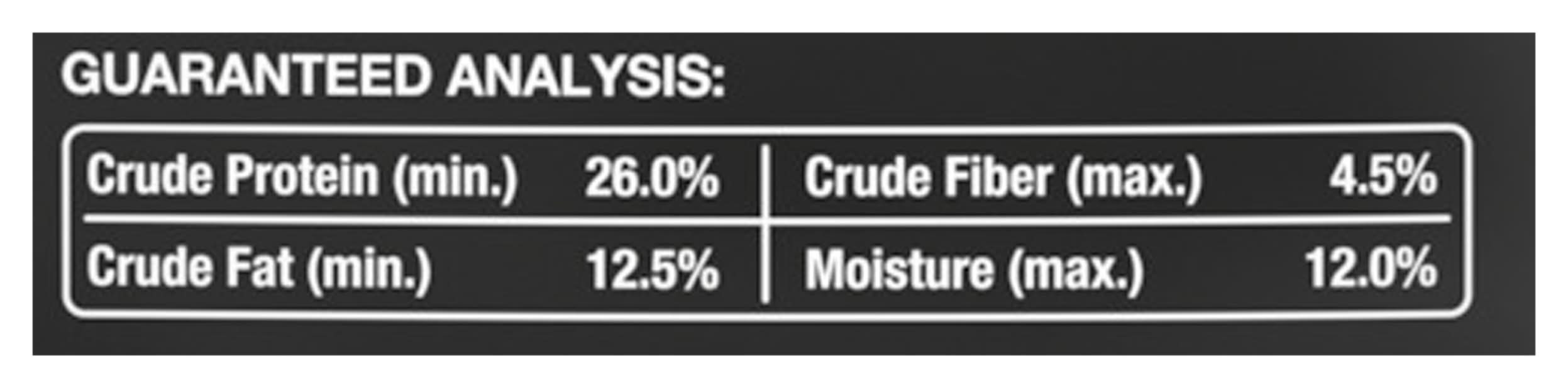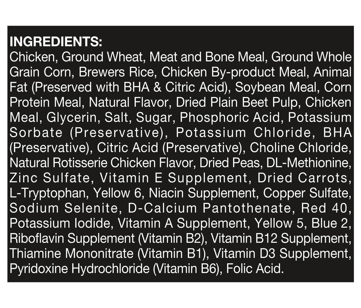 Ingredients: Chicken, Ground Wheat, Meat and Bone Meal, Ground Whole Grain Corn, Brewers Rice, Chicken By-Product Meal, Animal Fat (Preserved with BHA & Citric Acid), Soybean Meal, Corn Protein Meal, Natural Flavor, Dried Plain Beet Pulp, Chicken Meal, Glycerin, Salt, Sugar, Phosphoric Acid, Potassium Sorbate (Preservative), Potassium Chloride, BHA (Preservative), Citric Acid (Preservative), Choline Chloride, Natural Rotisserie Chicken Flavor, Dried Peas, DL-Methionine, Zinc Sulfate, Vitamin E Supplement, Dried Carrots, L-Tryptophan, Yellow 6, Niacin Supplement, Copper Sulfate, Sodium Selenite, D-Calcium Pantothenate, Red 40, Potassium Iodide, Vitamin A Supplement, Yellow 5, Blue 2, Riboflavin Supplement (Vitamin B2), Vitamin B12 Supplement, Thiamine Mononitrate (Vitamin B1), Vitamin D3 Supplement, Pyridoxine Hydrochloride (Vitamin B6), Folic Acid Contains: Wheat, Soybeans, gluten, fish