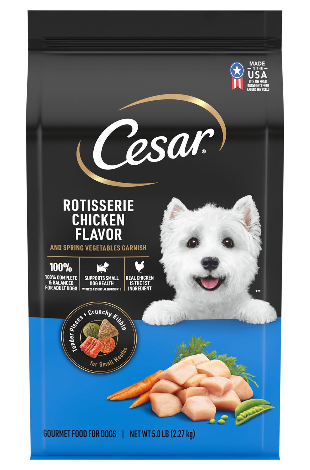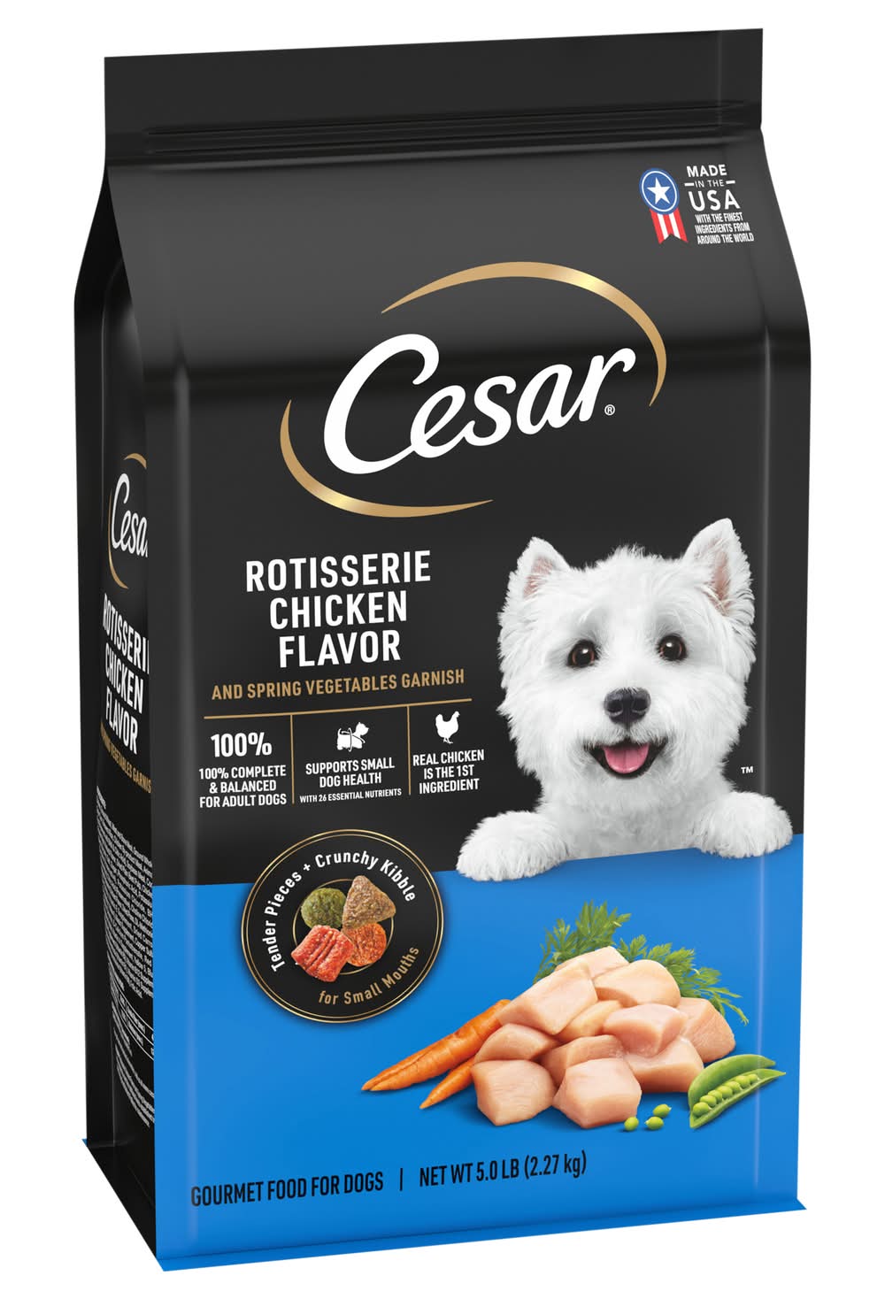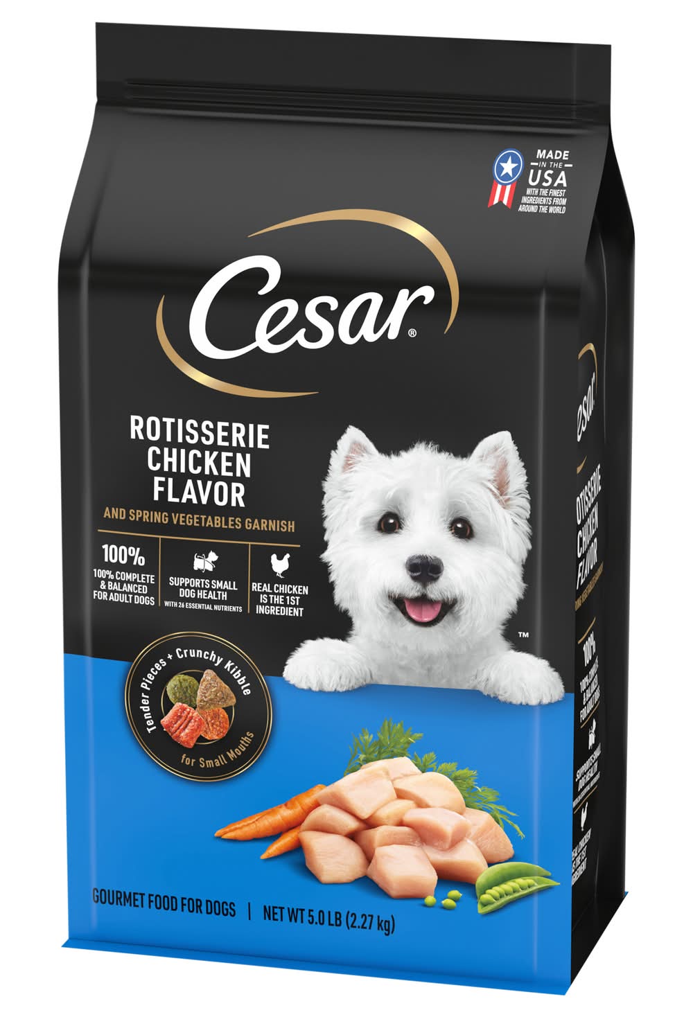 Give your dog a seat at the dinner table with CESAR Rotisserie Chicken Flavor and Spring Vegetables Garnish Dry Dog Food. Made with real chicken as the first ingredient, this gourmet dog food features tender pieces that will make your dog dance around their bowl come dinnertime. CESAR Food for Dogs is also deliciously crafted with 26 nutrients small dogs need to stay healthy. Serve your little furry companion a savory and nutritious meal with CESAR Dog Food. Contains one (1) 5 lb. bag of CESAR Rotisserie Chicken Flavor With Spring Vegetables Garnish Dry Dog Food CESAR Dry Dog Food is made with real chicken as the first ingredient for a taste dogs love This gourmet dog food is specially crafted with 26 nutrients that small breed dogs need Your adult dog will adore the delicious tender pieces included within CESAR Dry Dog food has a re-sealable zipper on every bag to help maintain freshness