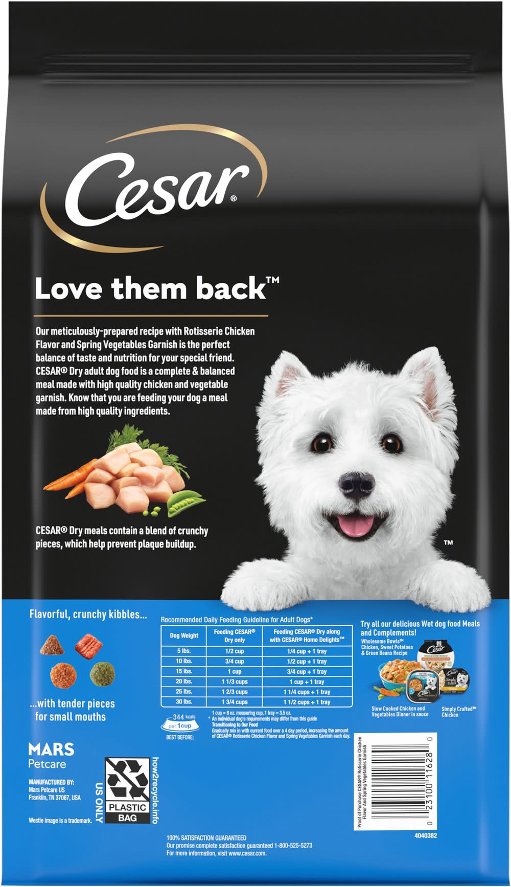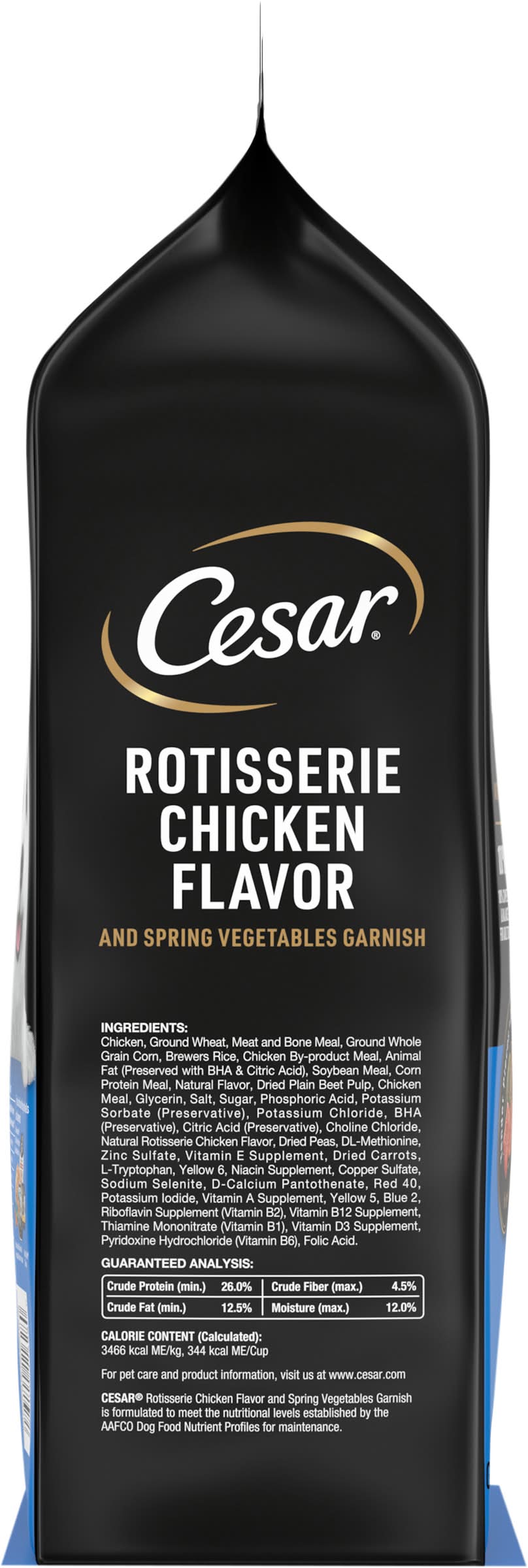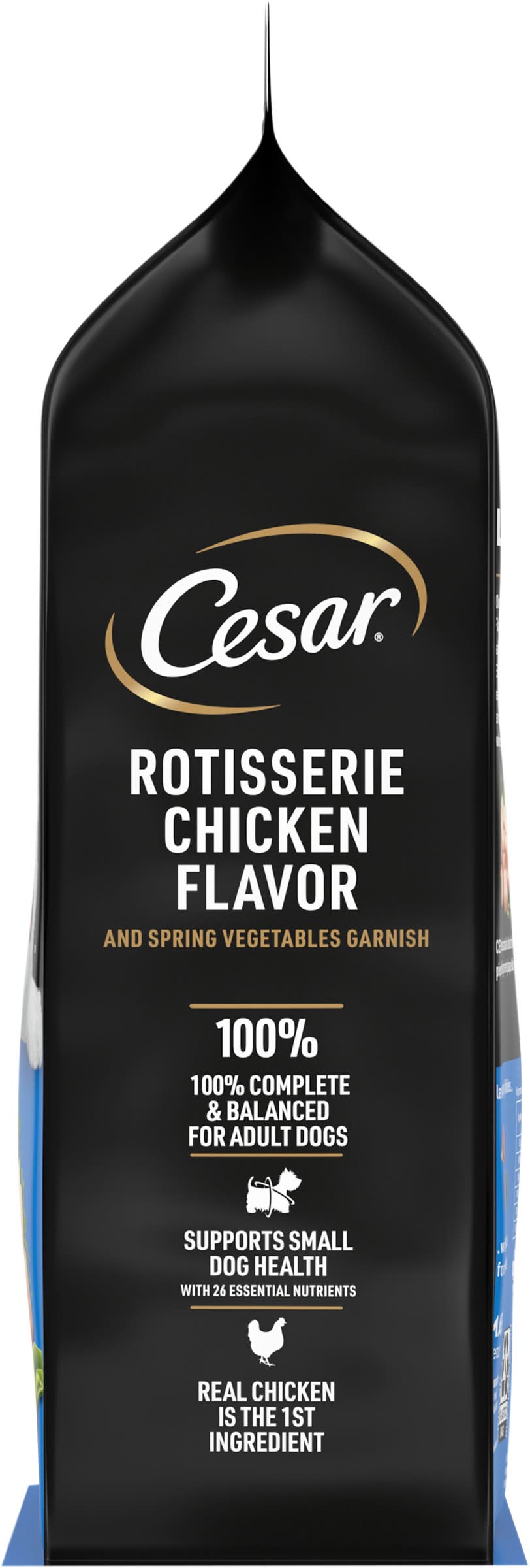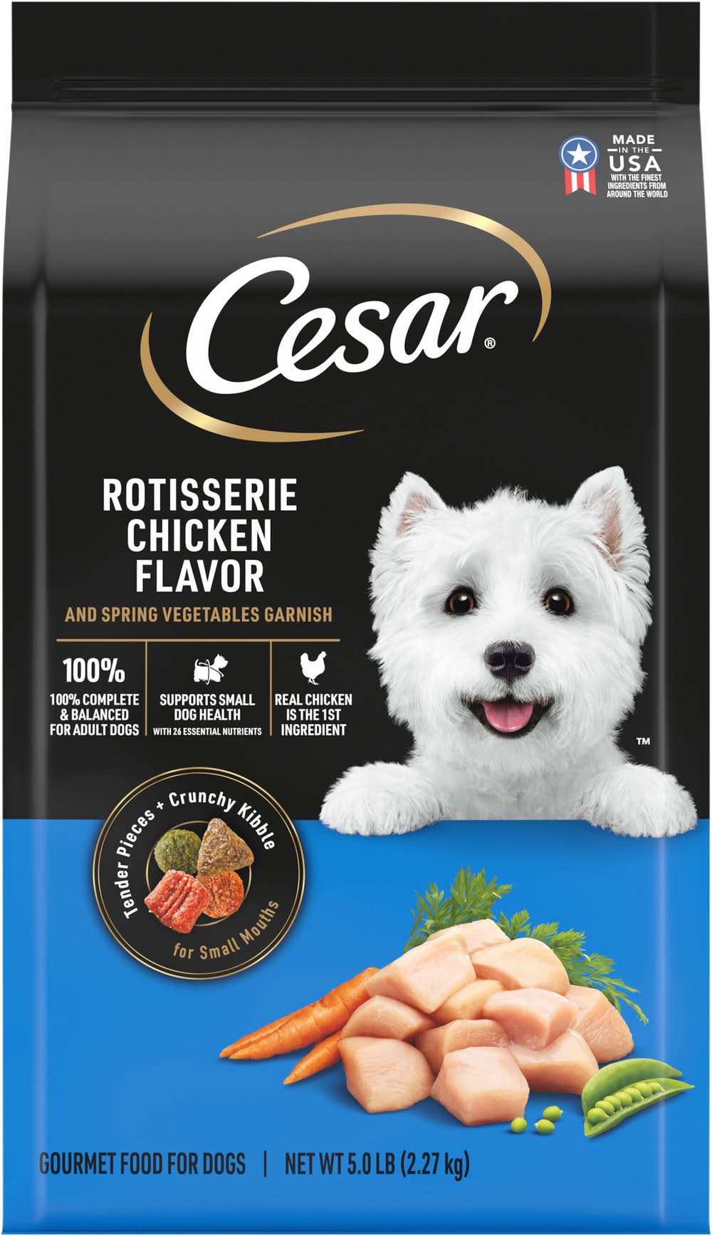 Give your dog a seat at the dinner table with CESAR Rotisserie Chicken Flavor and Spring Vegetables Garnish Dry Dog Food. Made with real chicken as the first ingredient, this gourmet dog food features tender pieces that will make your dog dance around their bowl come dinnertime. CESAR Food for Dogs is also deliciously crafted with 26 nutrients small dogs need to stay healthy. Serve your little furry companion a savory and nutritious meal with CESAR Dog Food. Contains one (1) 5 lb. bag of CESAR Rotisserie Chicken Flavor With Spring Vegetables Garnish Dry Dog Food CESAR Dry Dog Food is made with real chicken as the first ingredient for a taste dogs love This gourmet dog food is specially crafted with 26 nutrients that small breed dogs need Your adult dog will adore the delicious tender pieces included within CESAR Dry Dog food has a re-sealable zipper on every bag to help maintain freshness