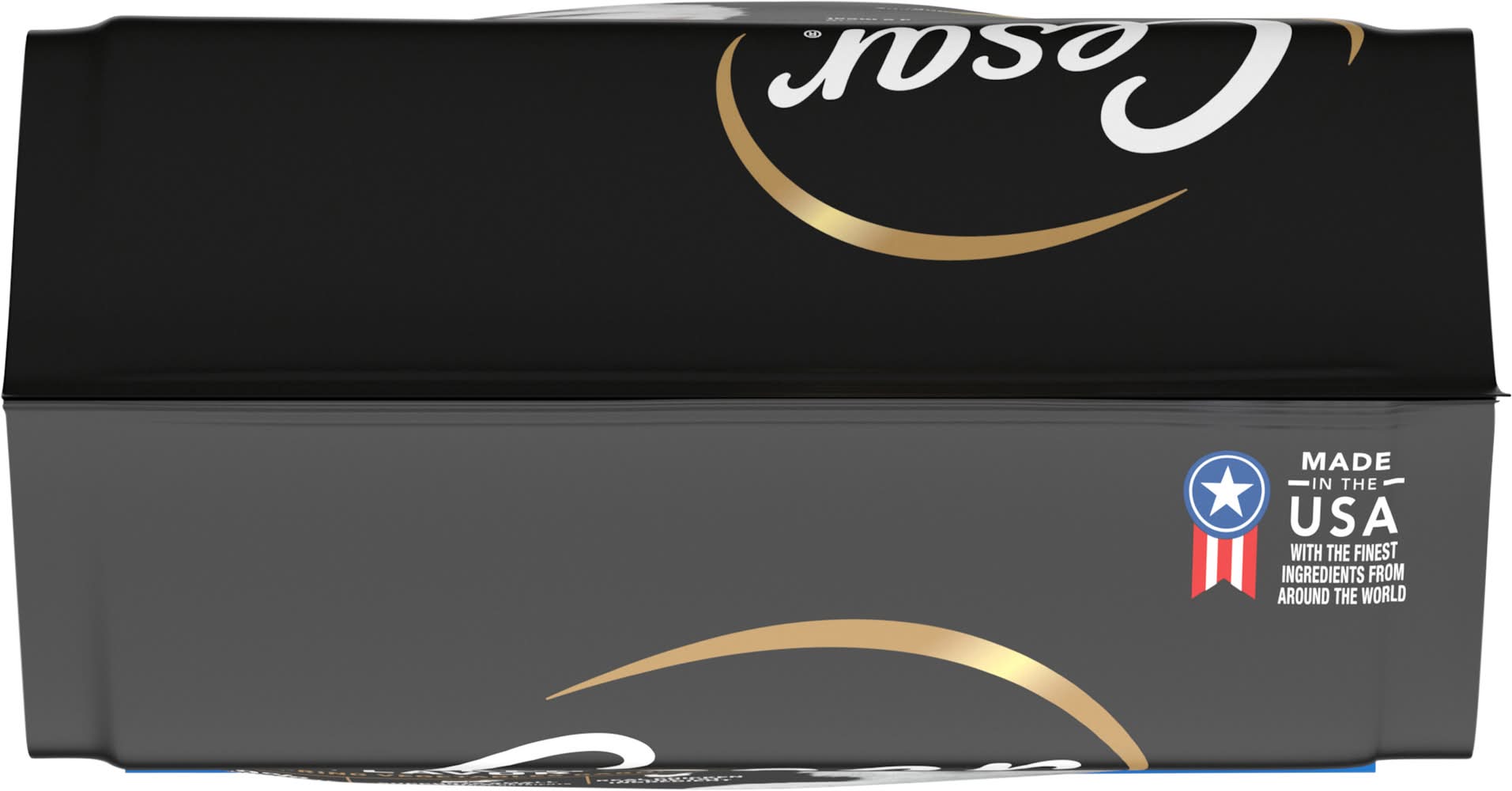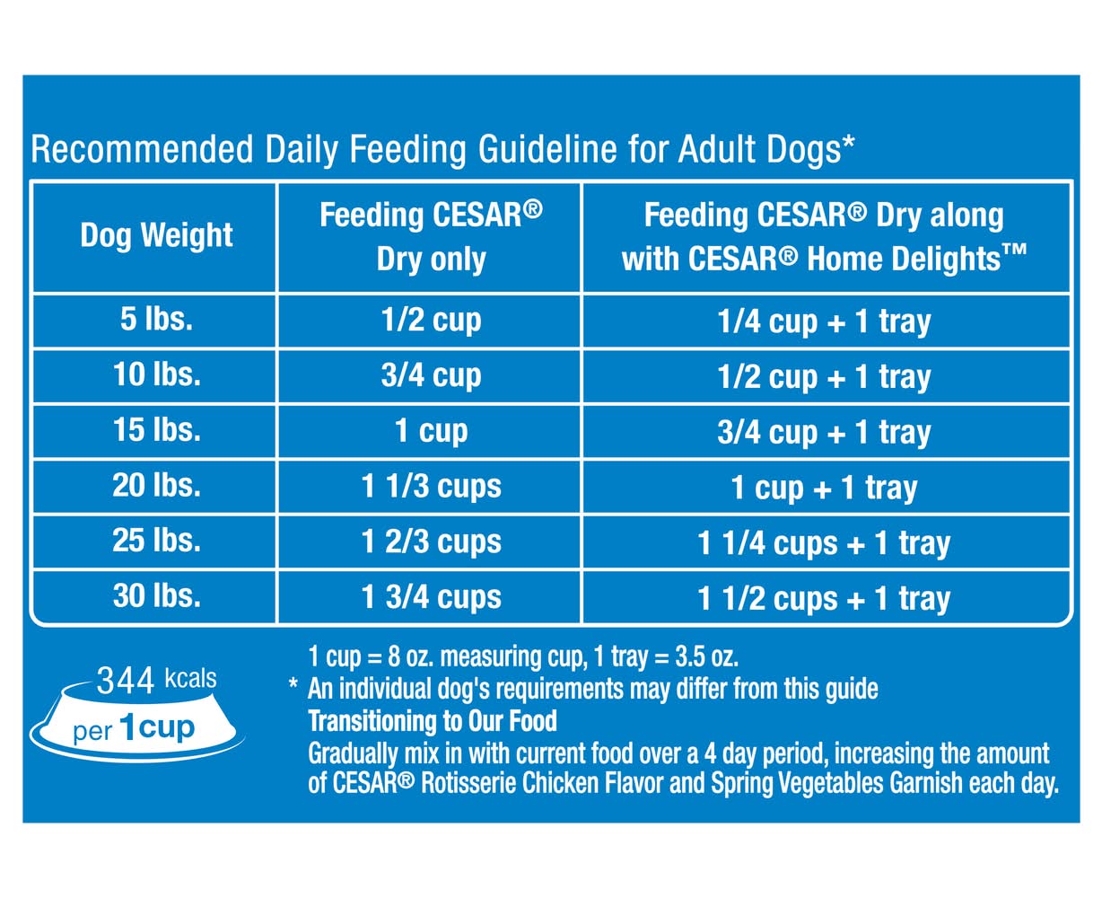 Recommended daily feeding guideline for adult dogs (an individual dog's requirements may differ from this guide transitioning to our food gradually mix in with current food over a 4 day period, increasing the amount of cesar rotisserie chicken flavor and spring vegetables garnish each day): dog weight: 5 lbs; 1/2 cup: feeding cesar dry only; 1/4 cup + 1 tray: (feeding cesar dry along with cesar home delights); dog weight: 10 lbs; 3/4 cups: feeding cesar dry only; 1/2 cup + 1 tray: (feeding cesar dry along with cesar home delights); dog weight: 15 lbs; 1 cups: feeding cesar dry only; 3/4 cup + 1 tray: (feeding cesar dry along with cesar home delights); dog weight: 20 lbs; 1-1/3 cups: feeding cesar dry only; 1 cup + 1 tray: (feeding cesar dry along with cesar home delights); dog weight: 25 lbs; 1-2/3 cups : feeding cesar dry only; 1-1/2 cup + 1 tray: (feeding cesar dry along with cesar home delights); dog weight: 30 lbs; 2 cups: feeding cesar dry only; 1-3/4 cup + 1 tray: (feeding cesar dry along with cesar home delights). 1 cup = 8 oz. measuring cup, 1 tray = 3.5 oz. pull tab to open.