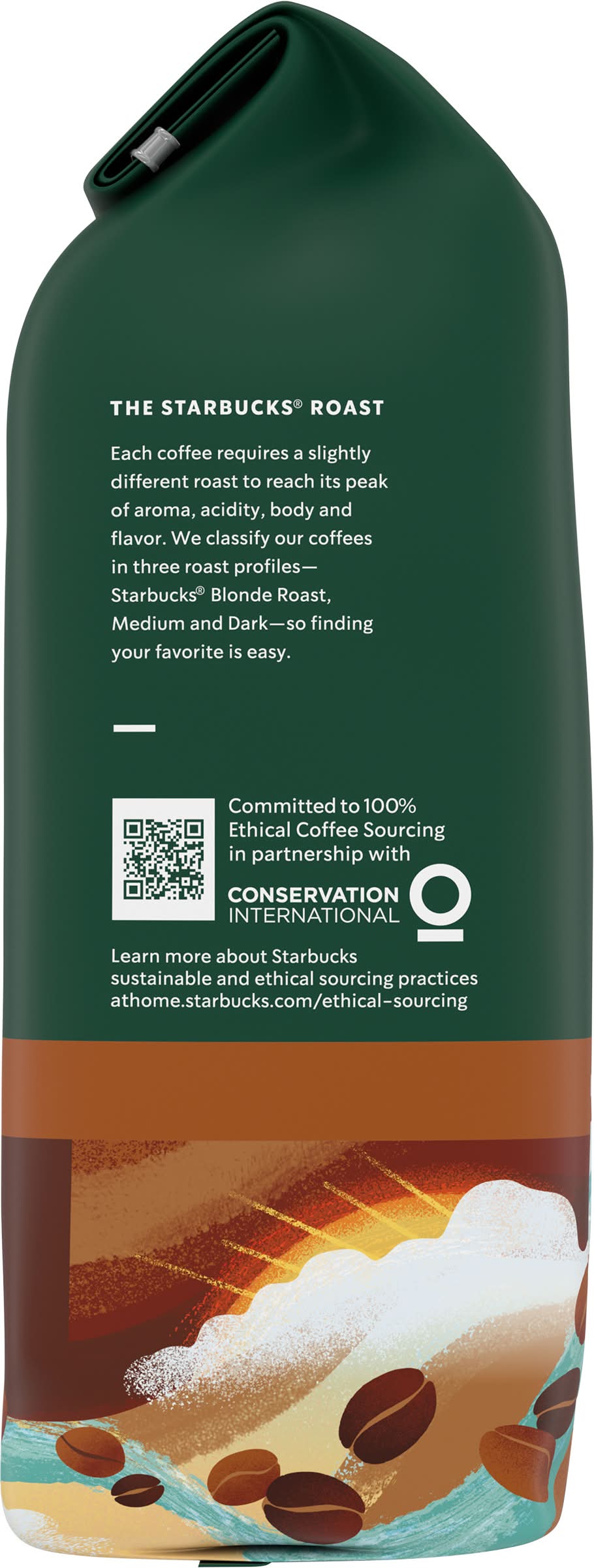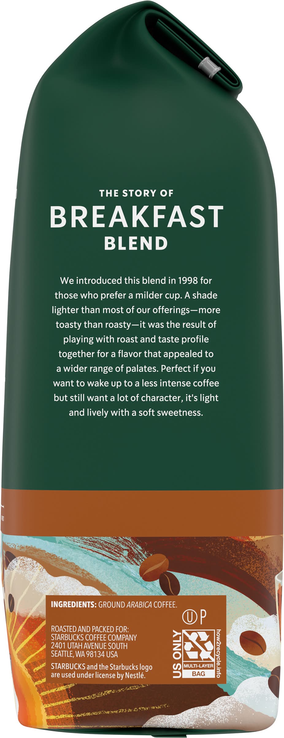 Notes of brown sugar & sweet orange. The Starbucks Roast: Each coffee requires a slightly different roast to reach its peak of aroma, acidity, body and flavor. We classify our coffees in three roast profiles - Starbucks Blonde Roast, medium and dark - so finding your favorite is easy. The Story of Breakfast Blend: We introduced this blend in 1998 for those who prefer a milder cup. A shade lighter than most of our offerings-more toasty than roast-it was the result of playing with roast and taste profile together for a flavor that appealed to a wider range of palates. Perfect if you want to wake up to a less intense coffee but still want a lot of character, it's light and lively with a soft sweetness. • Flavor: Brown sugar & sweet orange • Starbucks Coffee Company, 2401 Utah Avenue South, Seattle, WA • Packaging: Reusable