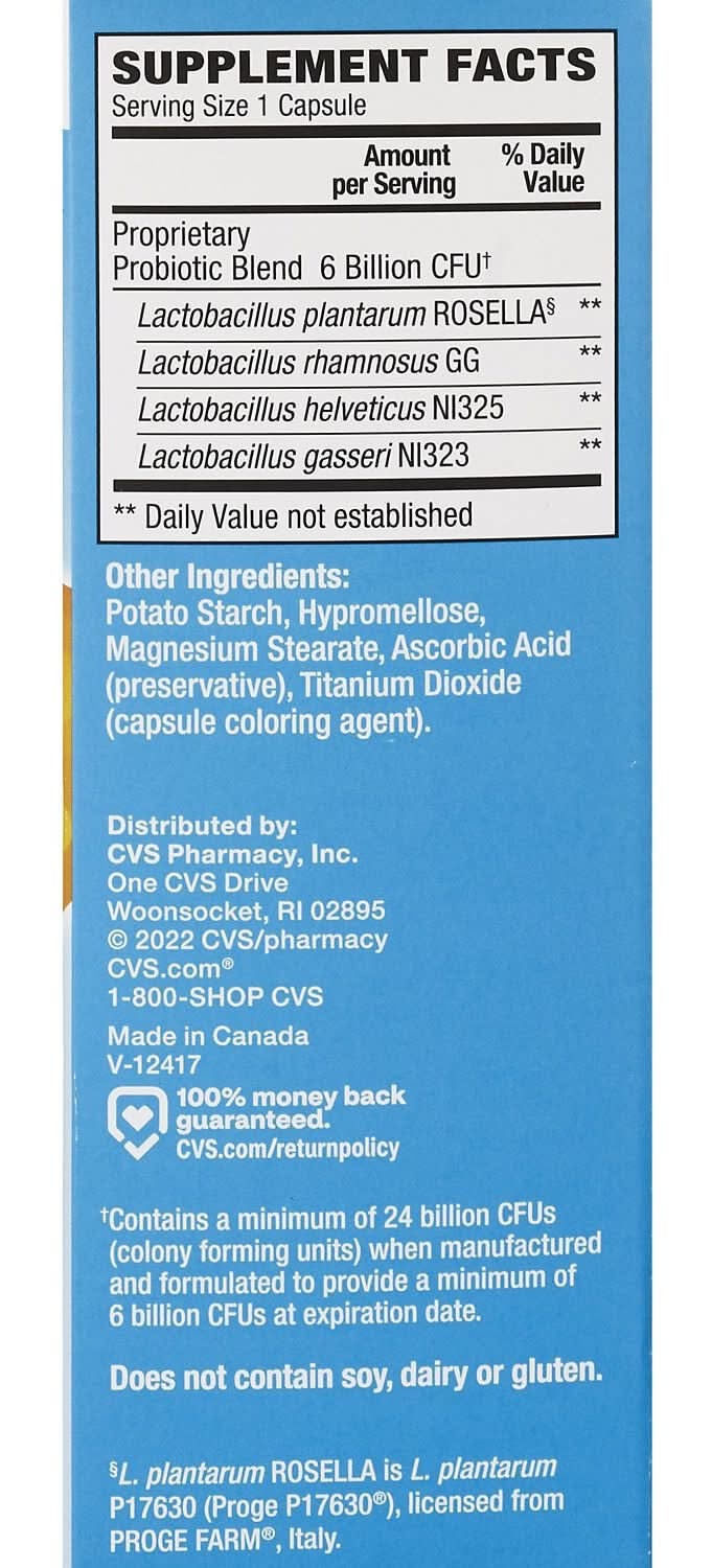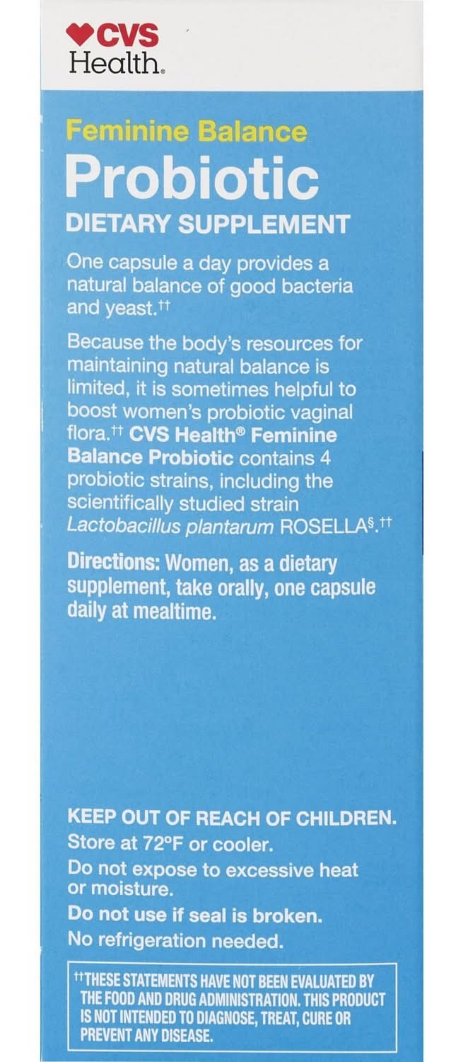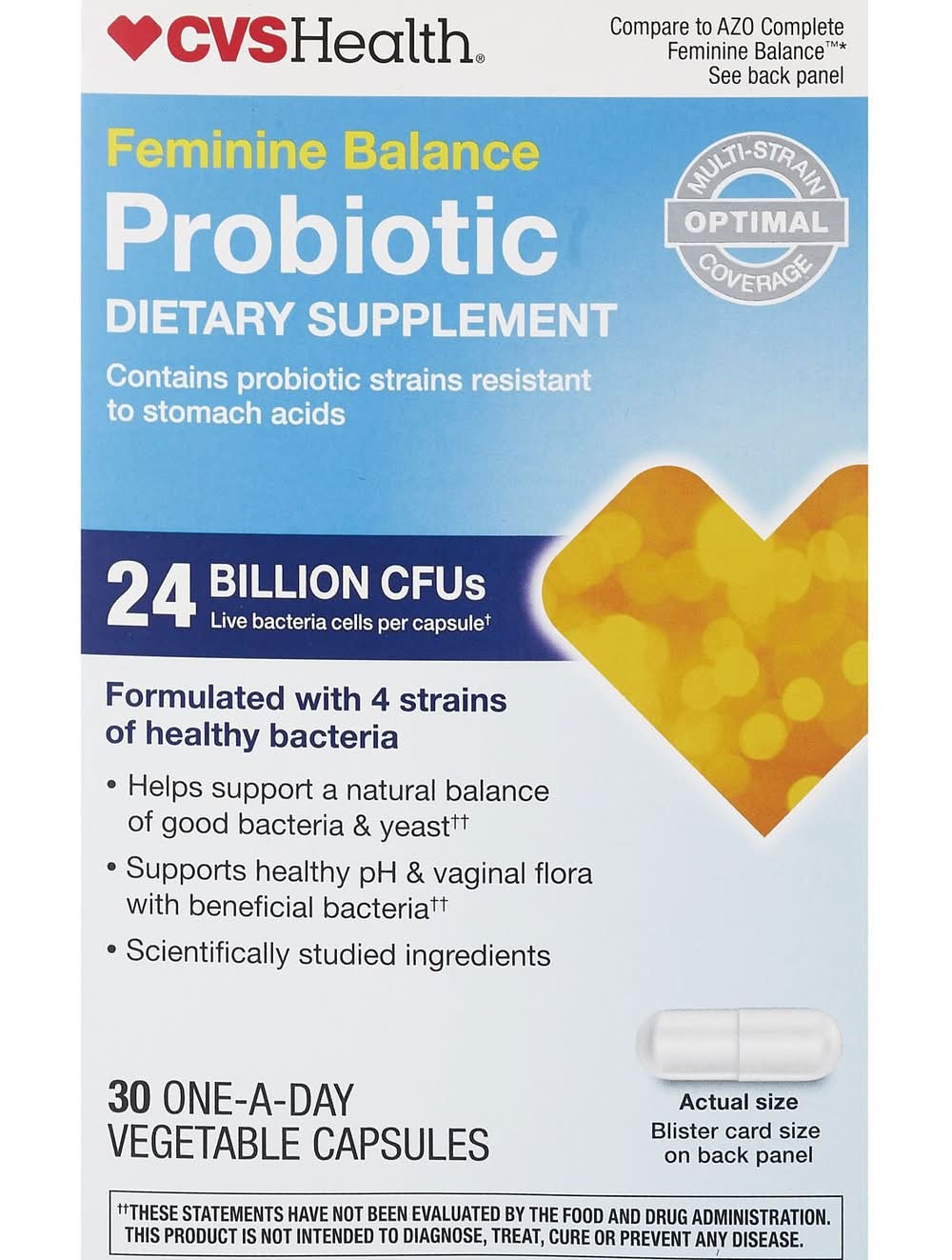 Probiotic dietary supplement for women Contains 24 billion CFUs per capsule Helps support a natural balance CVS Health quality 30-count Support your body's natural balance* with CVS Health Feminine Balance Probiotic Dietary Supplements. These probiotic capsules contain scientifically studied ingredients, including a minimum of 24 billion CFUs (colony forming units), or live bacteria cells per capsule when manufactured. They're formulated to provide a minimum of six billion CFUs at the expiration date. This dietary supplement features four strains of healthy bacteria, which may help to support a natural balance of good bacteria and yeast while supporting healthy vaginal pH and vaginal flora*. Be sure to use this product as directed per the packaging instructions. Women should take just one vegetable capsule per day, preferably with a meal, to maintain a healthy bacterial balance. This product does not contain soy, dairy, or gluten. Store this product at 72ºF or cooler and do not expose it to excessive heat or moisture. At CVS Health, we are passionate advocates for transforming health care into a more personalized experience through new technologies and innovations that can help improve the quality of your everyday life. *This statement has not been evaluated by the food and drug administration. this product is not intended to diagnose, treat, cure, or prevent any disease. Size: Actual size