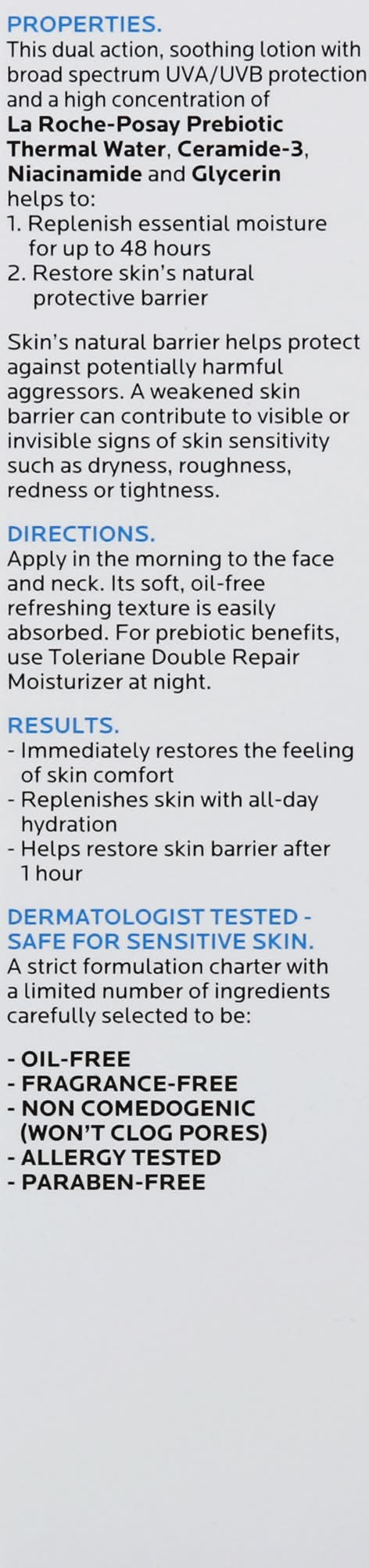 Directions: apply in the morning to the face and neck. its soft, oil-free refreshing texture is easily absorbed. for prebiotic benefits, use toleriane double repair moisturizer at night. for sunscreen use: apply generously 15 minutes before sun exposure. reapply at least every 2 hours. use a water resistant sunscreen if swimming or sweating. sun protection measures. spending time in the sun increases your risk of skin cancer and early skin aging. to decrease this risk, regularly use a sunscreen with a broad spectrum spf value of 15 or higher and other sun protection measures including: limit time in the sun, especially from 10 a.m. -2p.m. wear long-sleeved shirts, pants, hats and sunglasses. good for 12 months once opened. children under 6 months of age: ask a doctor.