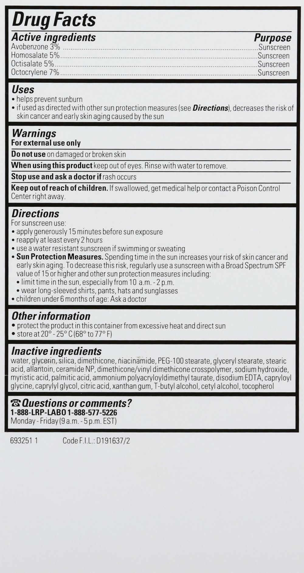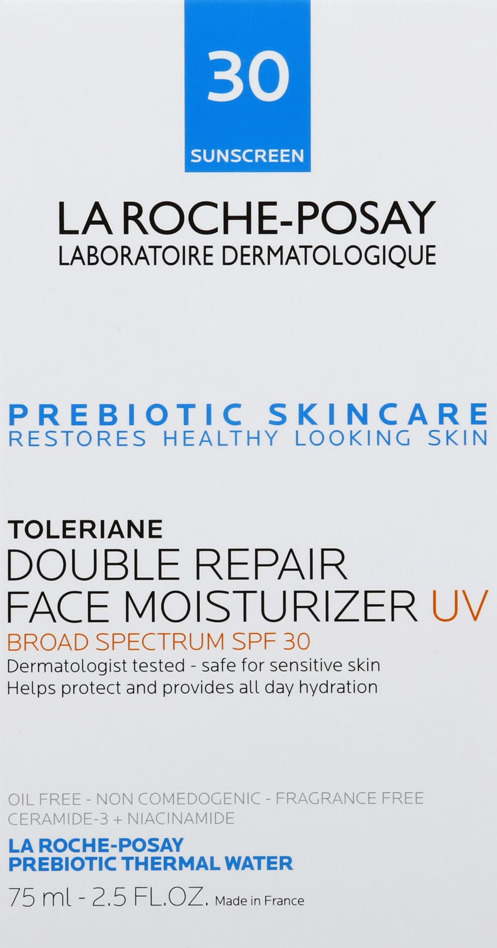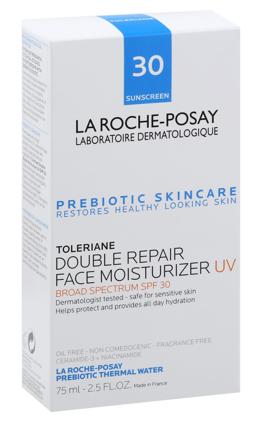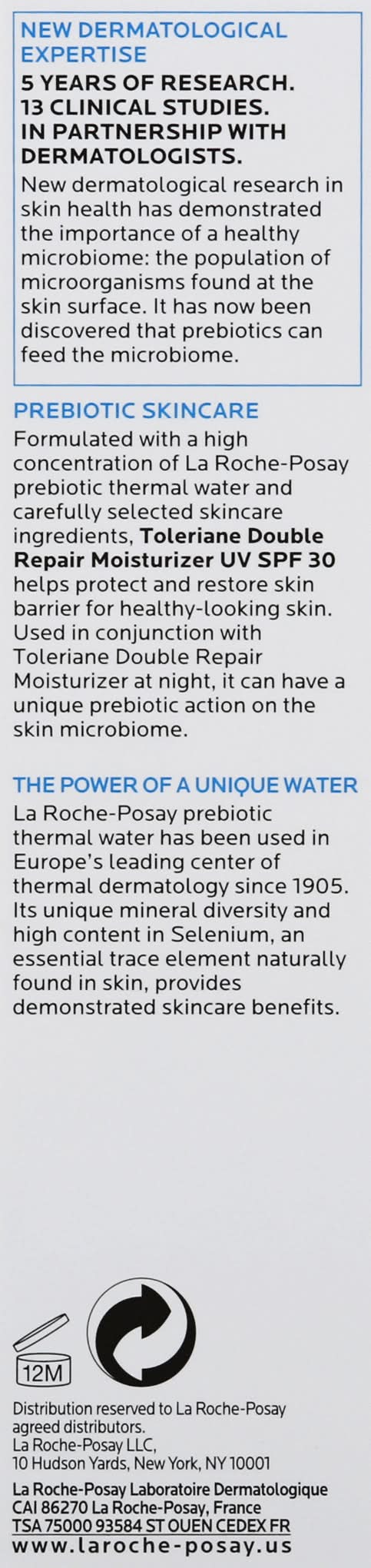 Protect the product in this container from excessive heat and direct sun. Store at 68 degrees to 77 degrees F (20 degrees -25 degrees C). Sunscreen 30. Restores healthy looking skin. Oil free. Non comedogenic. Fragrance free. Ceramide-3 + Niacinamide. Prebiotic thermal water. Dermatologists tested - safe for sensitive skin. Helps protect and provides all day hydration. New dermatological expertise. 5 Years of research. 13 Clinical studies. In partnership with dermatologists. New dermatological research in skin health has demonstrated the importance of a healthy microbiome: the population of microorganisms found at the skin surface. It has now been discovered that prebiotics can feed the microbiome. Prebiotic Skincare: Formulated with a high concentration of prebiotic thermal water and carefully selected skincare ingredients, Double Repair Moisturizer UV SPF 30 helps protect and restore skin barrier for healthy-looking skin. Used in conjunction with Repair Moisturizer at night, it can have a unique prebiotic action on the skin microbiome. The Power of a Unique Water: prebiotic thermal water has been used in Europe's leading center of thermal dermatology since 1905. Its unique mineral diversity and high content in Selenium, an essential trace element naturally found in skin, provides demonstrated skincare benefits. Properties: This dual action, soothing lotion with broad spectrum UVA/UVB protection and a high concentration of La Roche-Posay Prebiotic Thermal Water, Ceramide-3, Niacinamide and Glycerin helps to: 1. Replenish essential moisture for up to 48 hours 2. Restore skin's natural protective barrier. Skin's natural barrier helps protect against potentially harmful aggressors. A weakened skin barrier can contribute to visible or invisible signs of skin sensitivity such as dryness, roughness, redness or tightness. Results: Immediately restores the feeling of skin comfort - Replenishes skin with all-day hydration - Helps restore skin barrier after 1 hour. Dermatologist Tested - Safe for Sensitive Skin: A strict formulation charter with a limited number of ingredients carefully selected to be: Oil-free. Packaging: Reusable