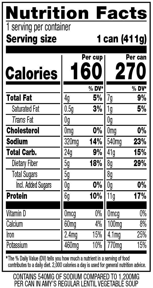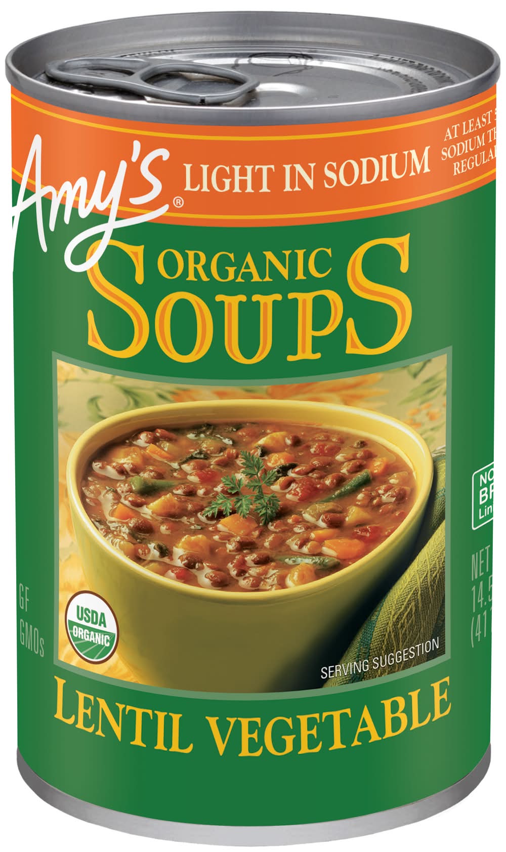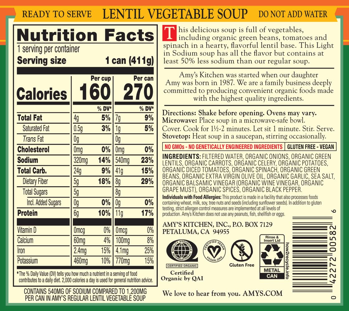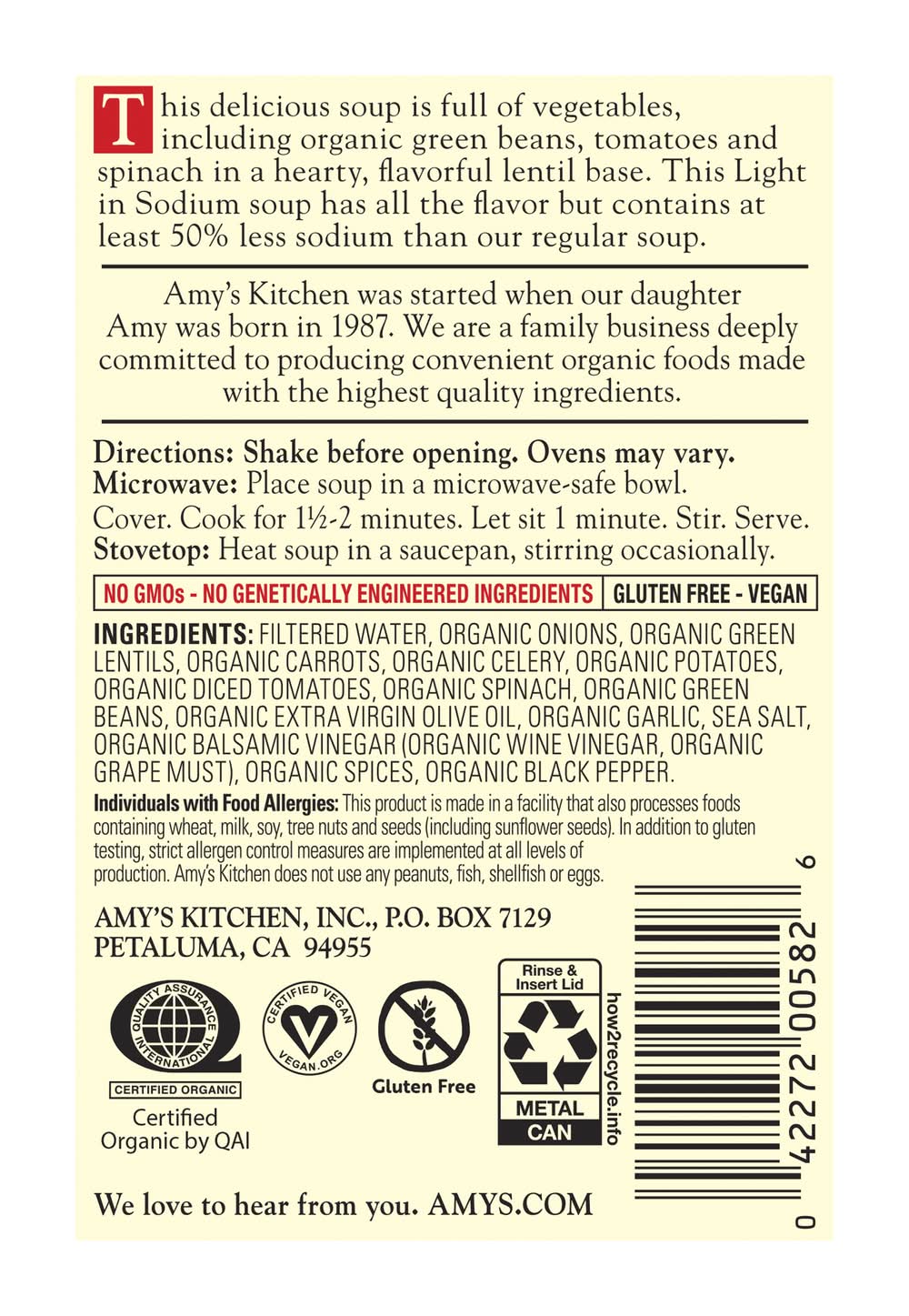Ready To Serve Lentil Vegetable Soup Light In Sodium Amy's Kitchen was started when our daughter Amy was born in 1987. We are a family business deeply committed to producing vegetarian natural and organic prepared foods that taste homemade. This delicious soup is full of vegetables including organic green beans, tomatoes and spinach in a hearty, flavorful lentil base. Responding to customer requests, our chefs have created a line of "Light in Sodium" soups with all the flavor and goodness of our regular soups, but containing 50% less sodium. No Trans Fat No Added MSG No Preservatives No GMOs - Bioengineered Ingredients Gluten Free • Amy's Kitchen, Inc., PO Box 7129,Petaluma,CA 94955 • Packaging: Reusable