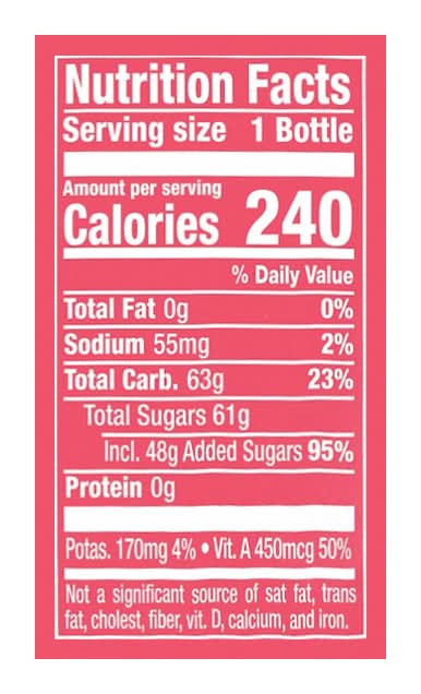 Ingredients: Filtered Water, High Fructose Corn Syrup, Pear Juice Concentrate, Strawberry Puree, Banana Puree, Carrot Juice Concentrate, Citric Acid, Natural Flavors, Rosemary Extract, Acacia Gum, Red 40, Beta Carotene (for Color)