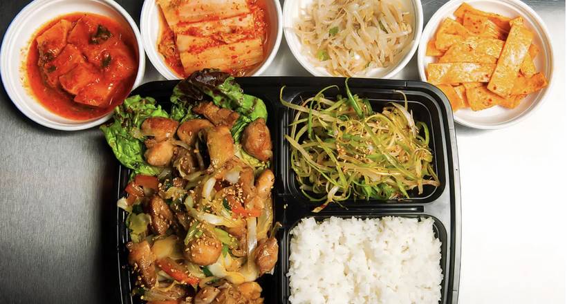 Marinated Chicken "Lunchbox" set including rice, scallion salad, and Korean side dishes.