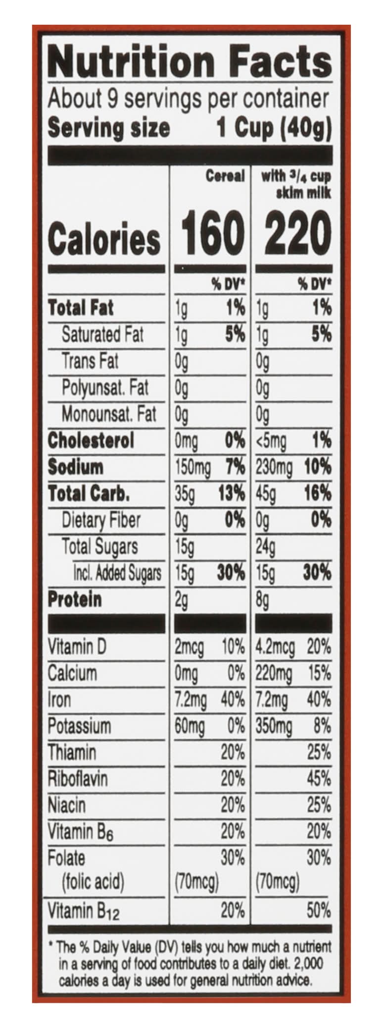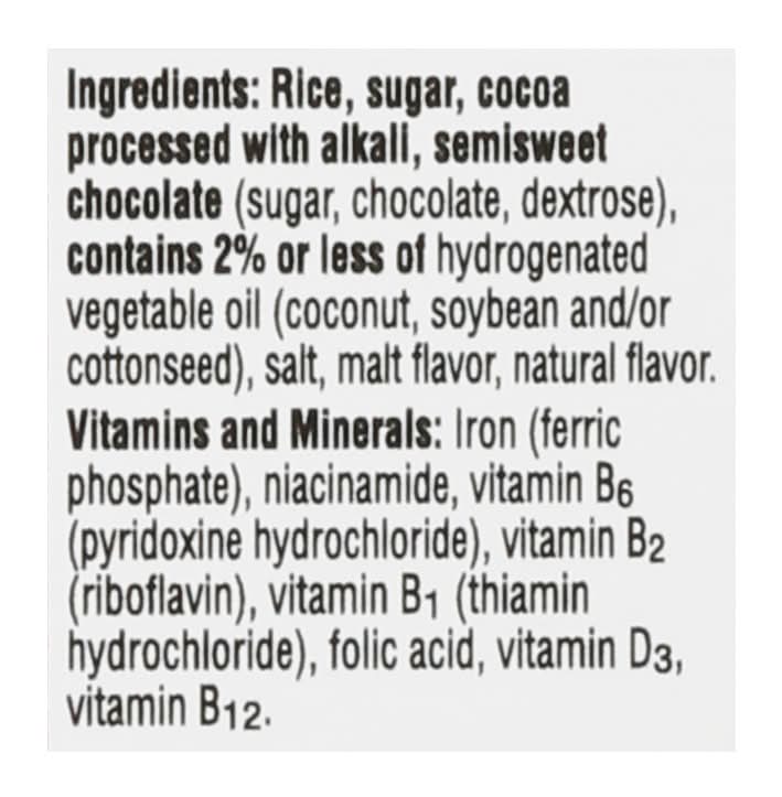 Ingredients: Rice, Sugar, Cocoa Processed with Alkali, Semisweet Chocolate (Sugar Chocolate Dextrose), Contains 2% or Less of Hydrogenated Vegetable Oil (Coconut Soybean and/or Cottonseed), Salt, Malt Flavor, Natural Flavor, Vitamins and Minerals: Iron (Ferric Phosphate), Niacinamide, Vitamin B6 (Pyridoxine Hydrochloride), Vitamin B2 (Riboflavin), Vitamin B1 (Thiamin Hydrochloride), Folic Acid, Vitamin D3, Vitamin B19 Contains: Tree Nuts, Soybeans