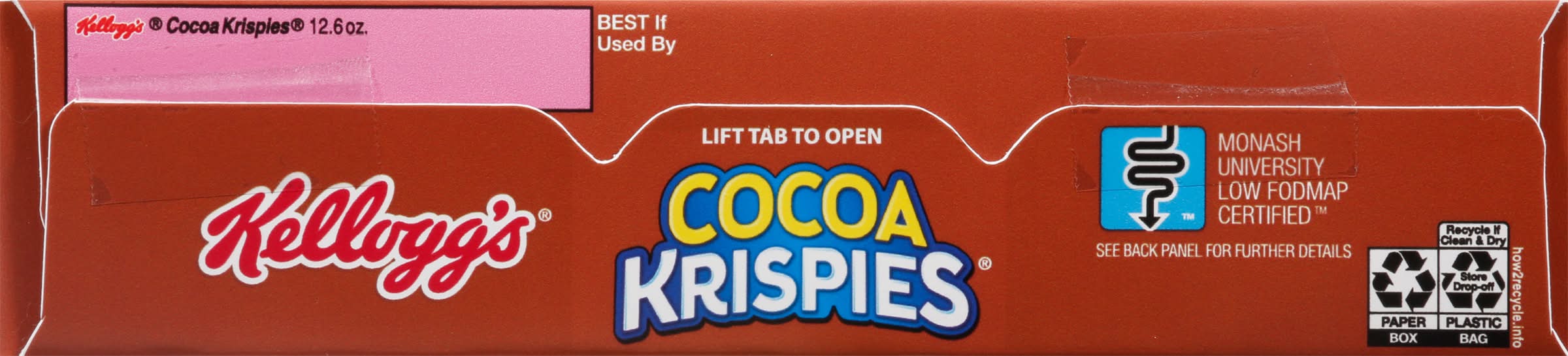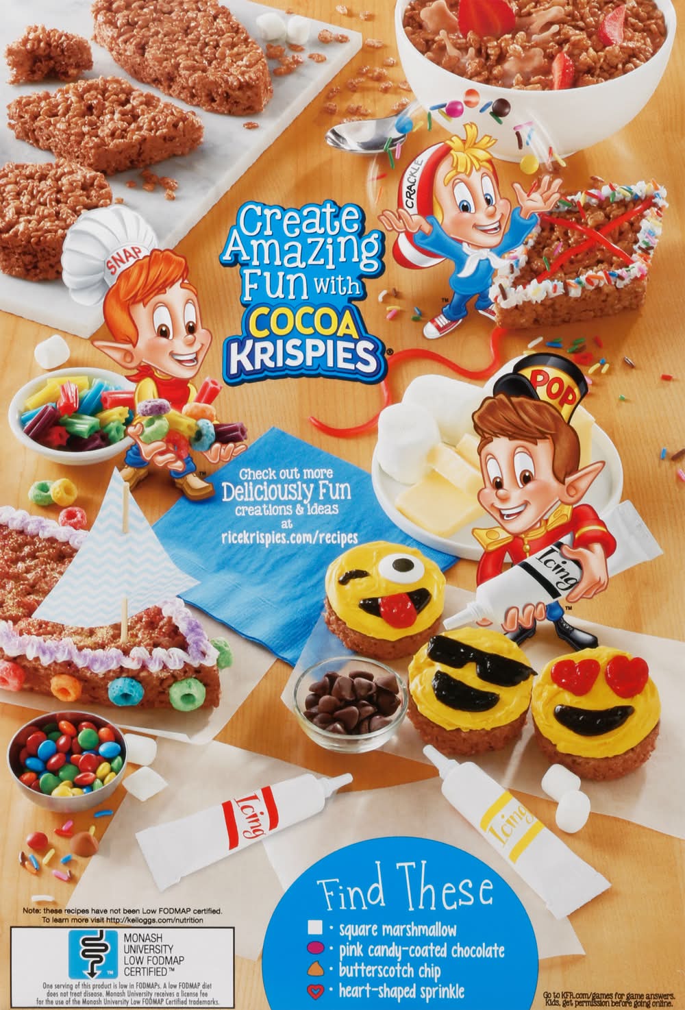 Chocolatey, sweetened cereal. Good source of 8 vitamins & minerals. Monash University low fodmap certified. See back panel for further details. Note: These recipes have bot been low fodmap certified. One serving of this product is low in fodmaps. A low fodmap diet does not treat disease. Monash University receives a license fee for the use of the Monash University low fodmap certified trademarks. Contains bioengineered food ingredient. Snap, Crackle. Snap Pop Create amazing fun with cocoa Krispies. • Brand: Cocoa krispies • Flavor: Chocolatey • kosher • Packaging: Reusable
