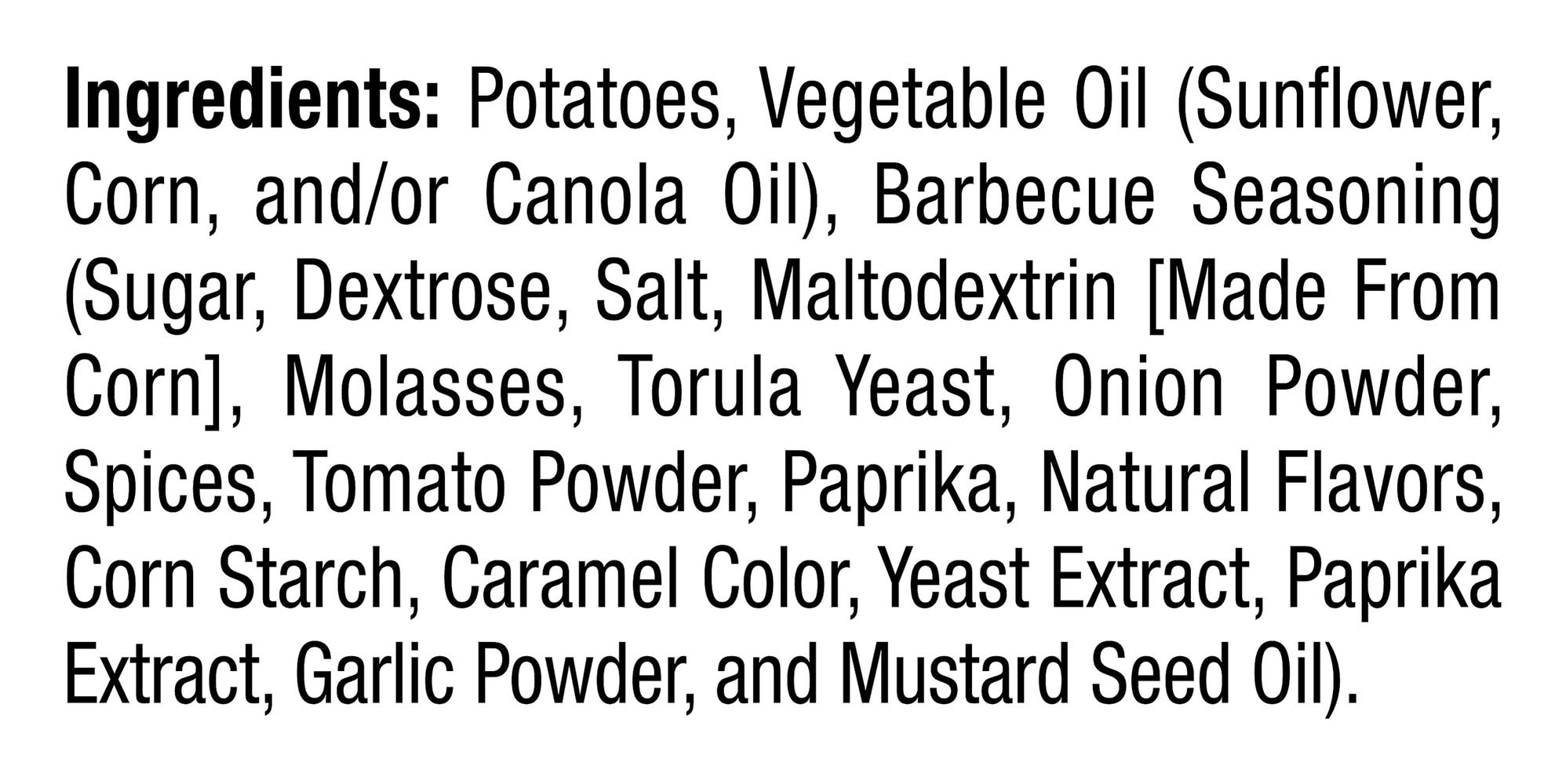Ingredients: Potatoes, Vegetable Oil (Sunflower, Corn, and or Canola Oil), Barbecue Seasoning (Sugar, Dextrose, Salt, Maltodextrin [Made from Corn], Molasses, Torula Yeast, Onion Powder, Spices, Tomato Powder, Paprika, Natural Flavors, Corn Starch, Caramel Color, Yeast Extract, Paprika Extract, Garlic Powder, and Mustard Seed Oil)