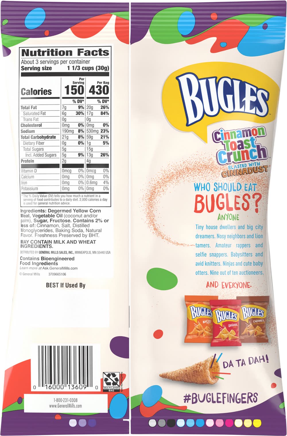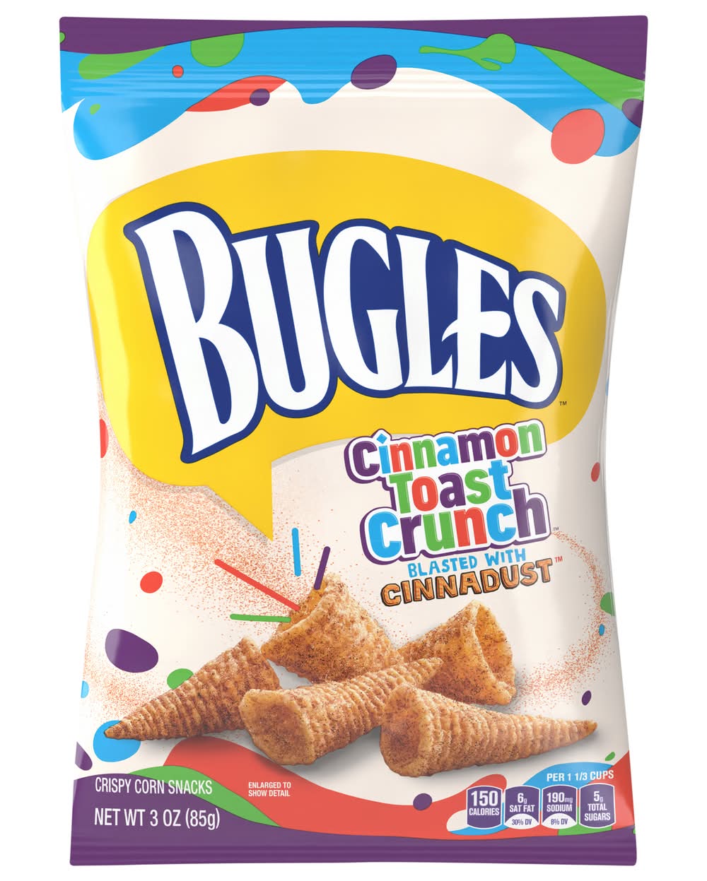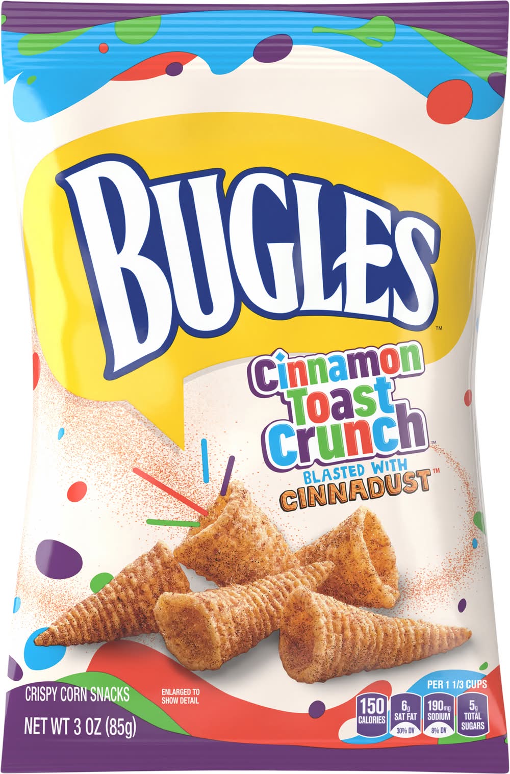 Sound the trumpets. Er ... Bugles. We took everything you love about Cinnamon Toast Crunch cereal and created a sweet Bugles flavor you can share with friends and family. Every cone-shaped piece is blasted with the epic cinnamon and sugar combination we call Cinnadust. Crunchy and irresistibly delicious, it's perfect for snacktime, or anytime. If you're looking for a quick and easy snack idea, it doesn't get more awesome than this. Enjoy by the bowlful, handful or forkful (hey, we don't judge). Just reach into the bag, pop them into your mouth and enjoy. Grab a fistful as you're headed out the door, pack a snack for when you're on the go, enjoy it as a bedtime snack, or have a bag ready for a midnight snack (or when your host your kids' next sleepover). Bugles Crispy Corn Snacks makes great, delicious fun for both kids and kids at heart. Contains one three oz snack bag. Flavor: Cinnamon toast crunch